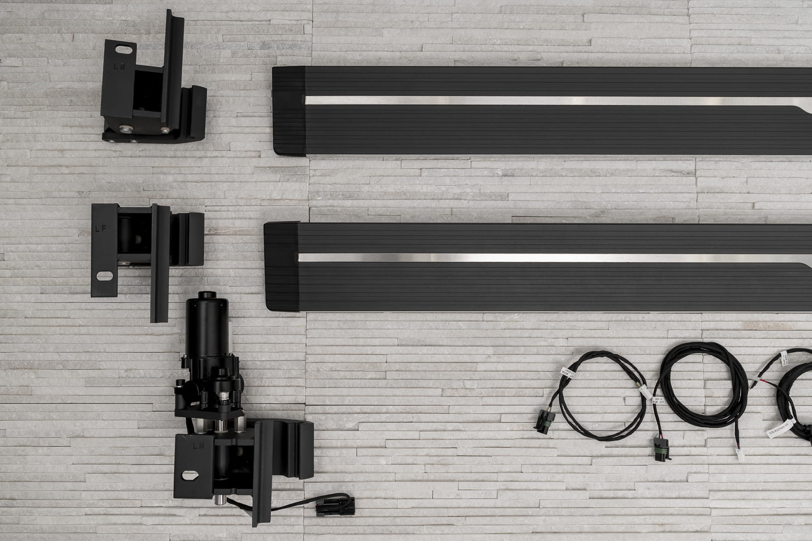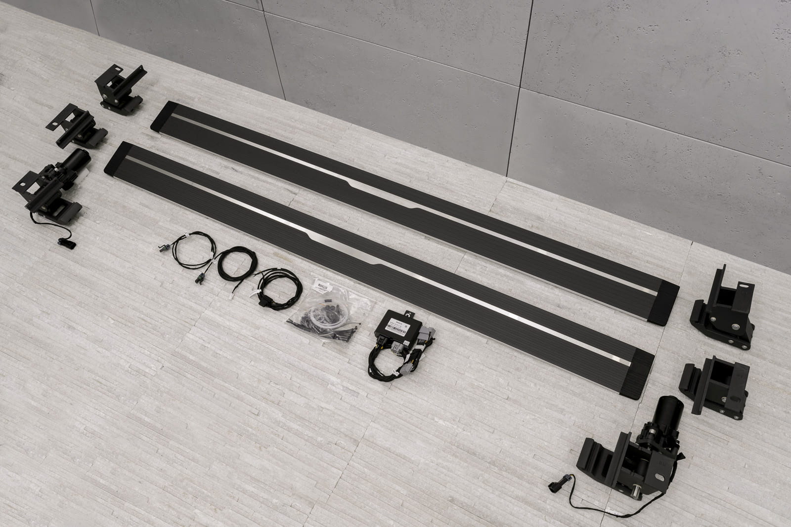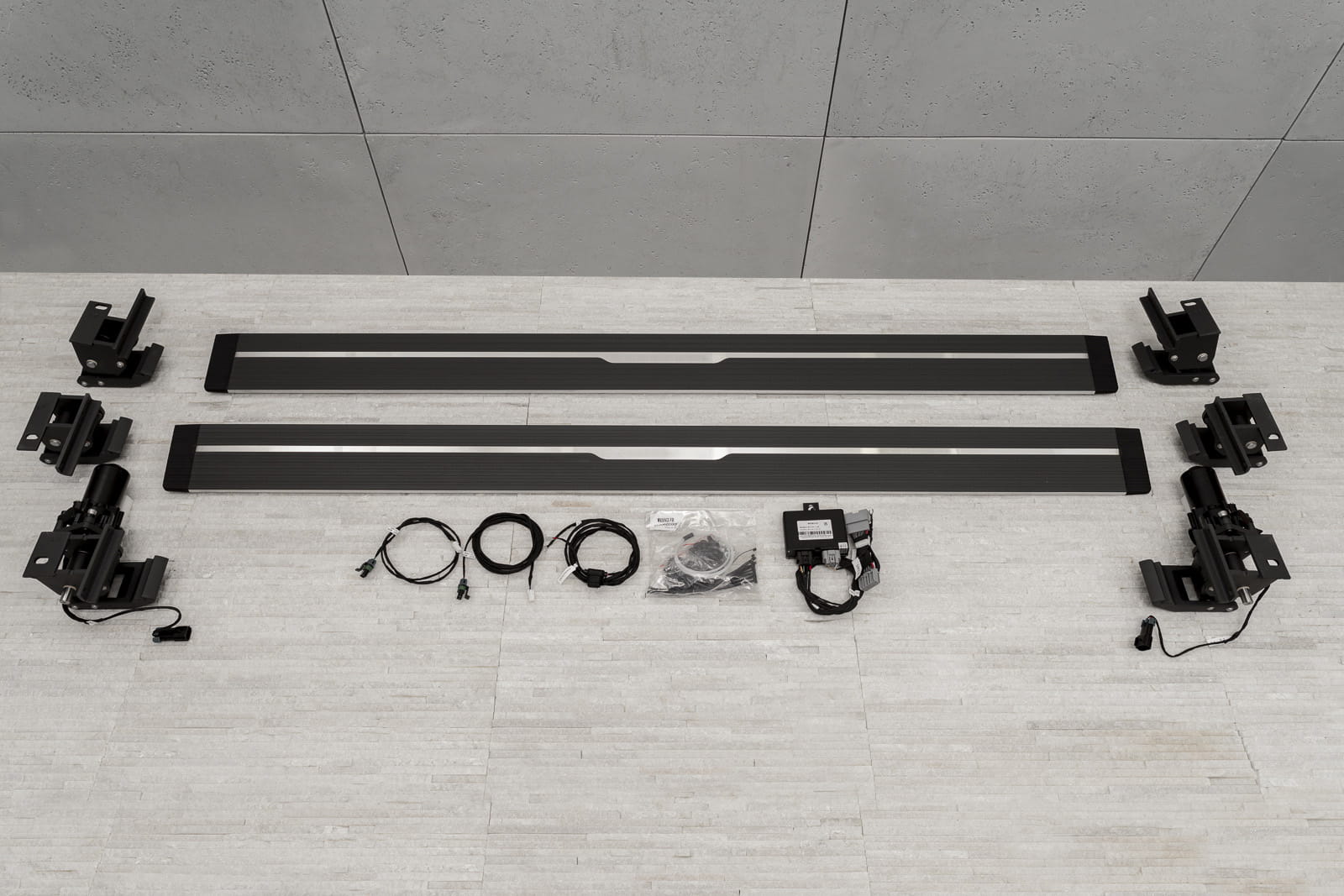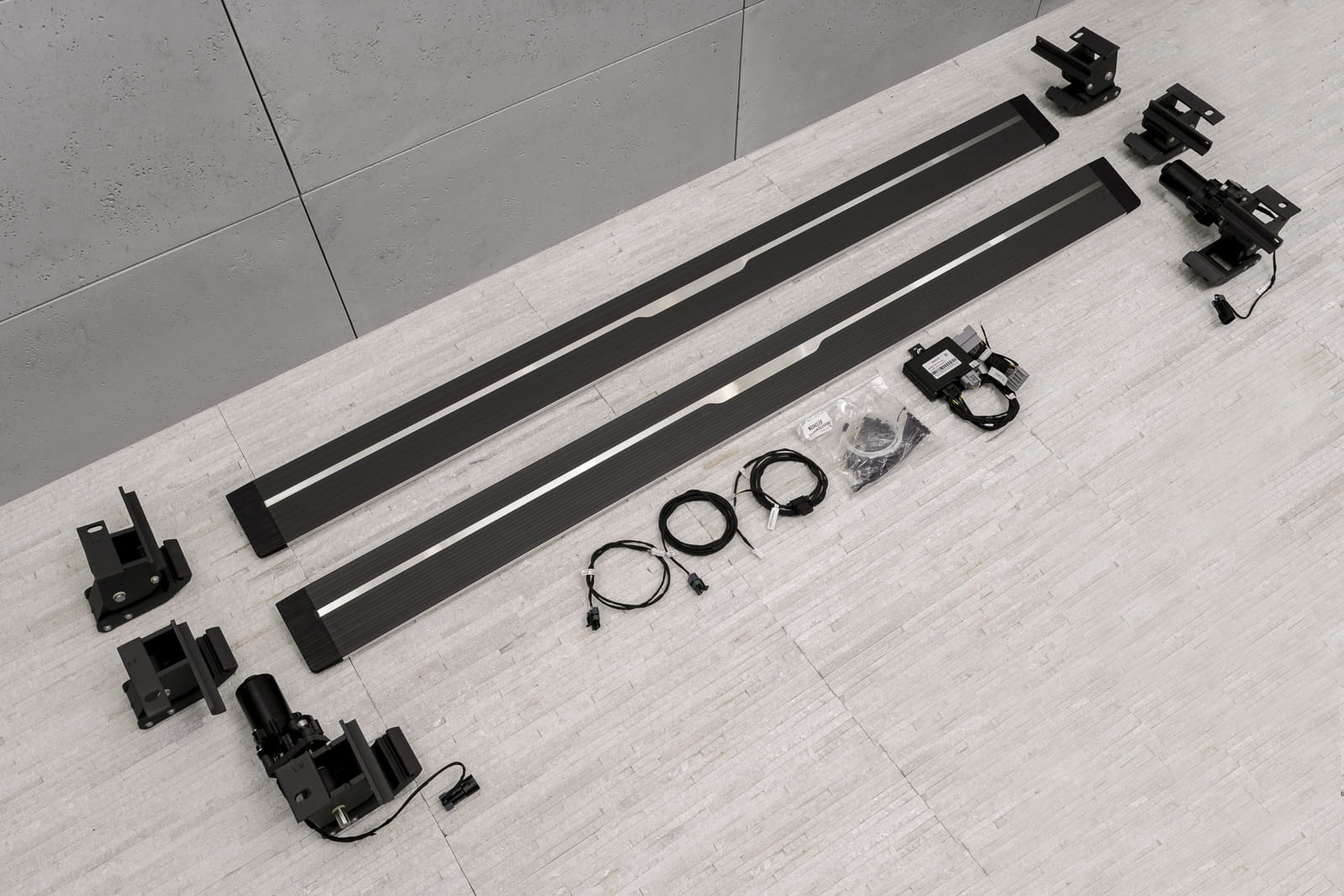 Stopnie zaprojektowano w sposób uniemożliwiający przytrzaśnięcie nogi (zatrzymują się napotykając na opór przy chowaniu się). W pozycji złożonej, progi nie zmniejszają prześwitu. Produkt nowy, zapakowany w pudełko. W zestawie komplet stopni bocznych (lewy i prawy), cztery silniki, elementy montażowe oraz instrukcja.