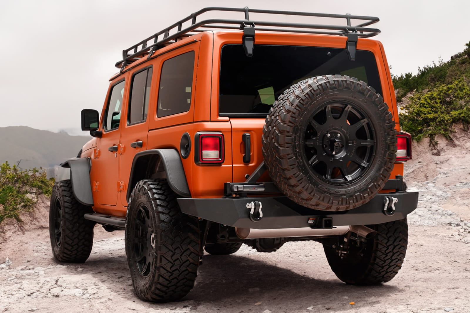 Szeroki zderzak tylny z zawiesiem koła zapasowego dedykowany do modelu JEEP WRANGLER JL 2018+ 2D i 4D.