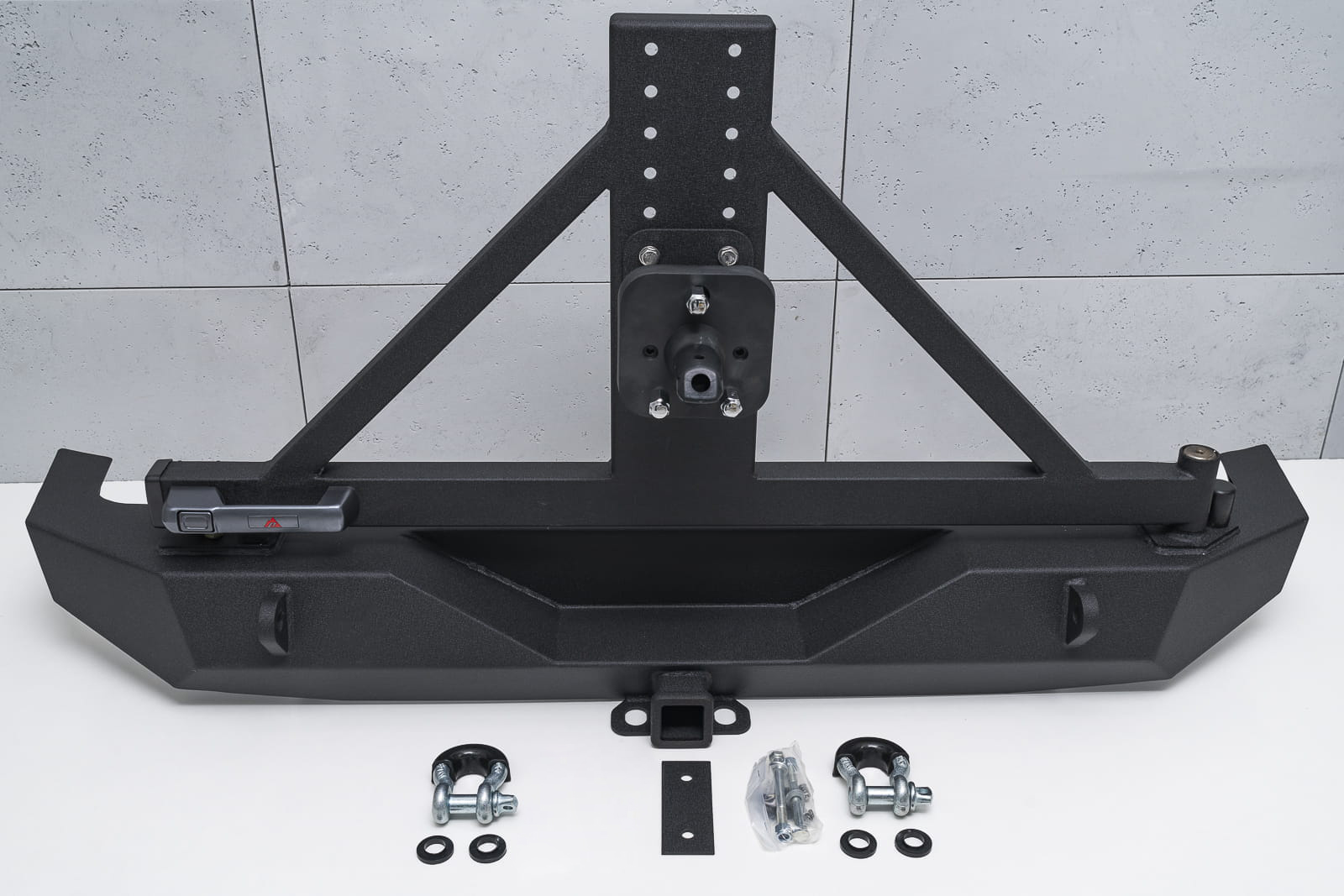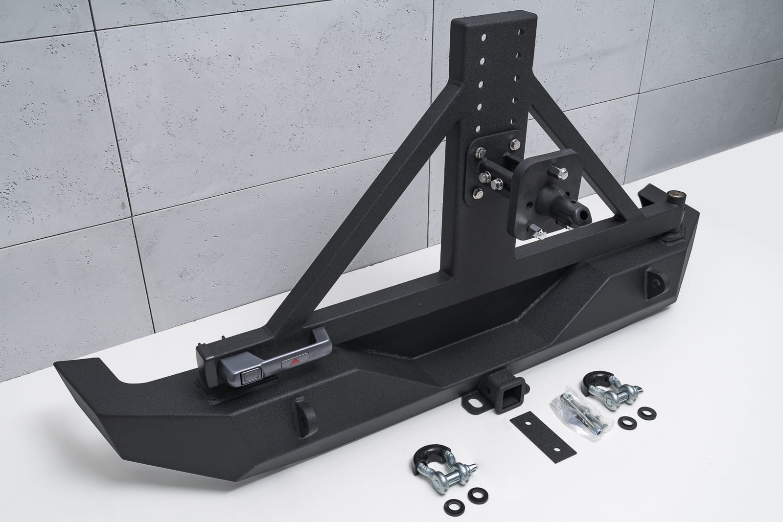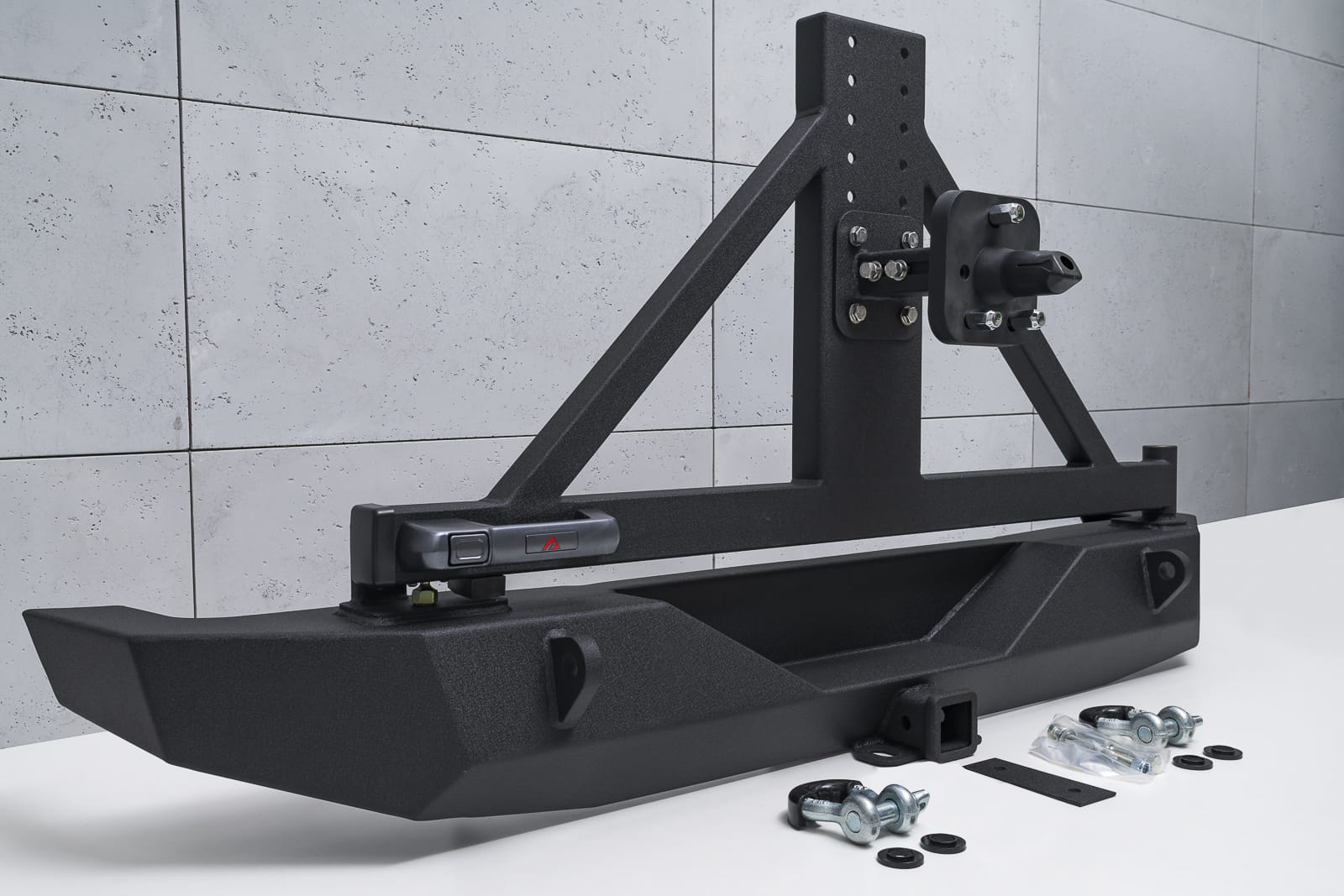 Odporny na wszystko, co tylko stanie na jego drodze zderzak jest nie lada gratką dla entuzjastów off-roadu i stylistyki Wranglera. Doposażony w silne mocowania na szekle oraz specjalny uchwyt pozwalający zamocować hak. Ramię koła mocowane jest na zaczepie tylnego zderzaka, zamykanym stylową klamką nowego typu służącą do zdjęcia rygla otwierającego uchwyt koła zapasowego. Zderzak posiada stopniową regulację pod wielkość opony, nawet do 40 cali. Ramię jest dodatkowo wzmocnione, co pozwala na pewną jazdę również w terenie. Dodatkowo zderzak posiada specjalnie wyprofilowanie i osłonięte gniazdo przeznaczone pod kamerę cofania, która znajduje się w kole zapasowym.