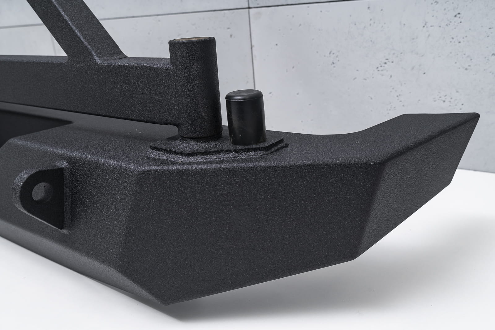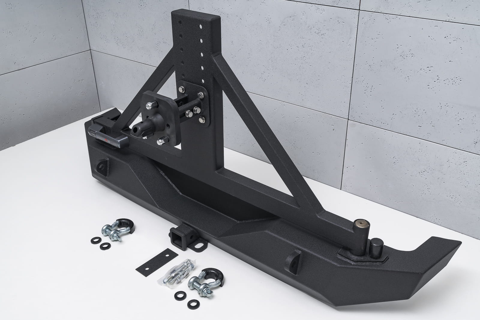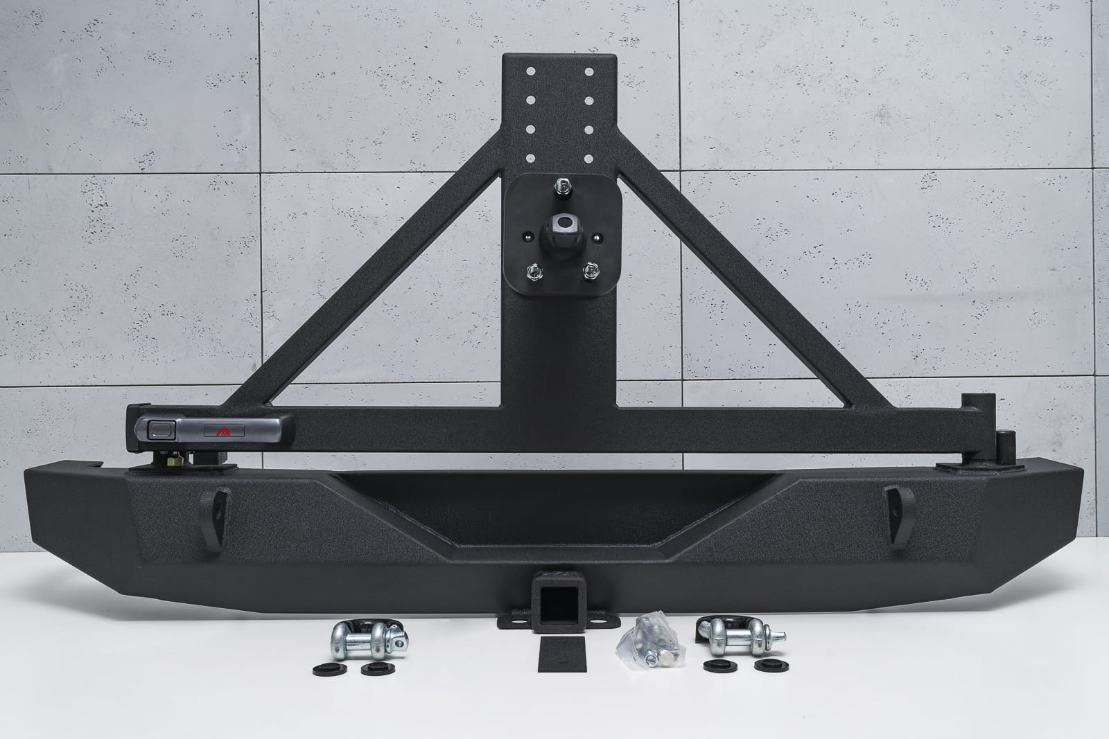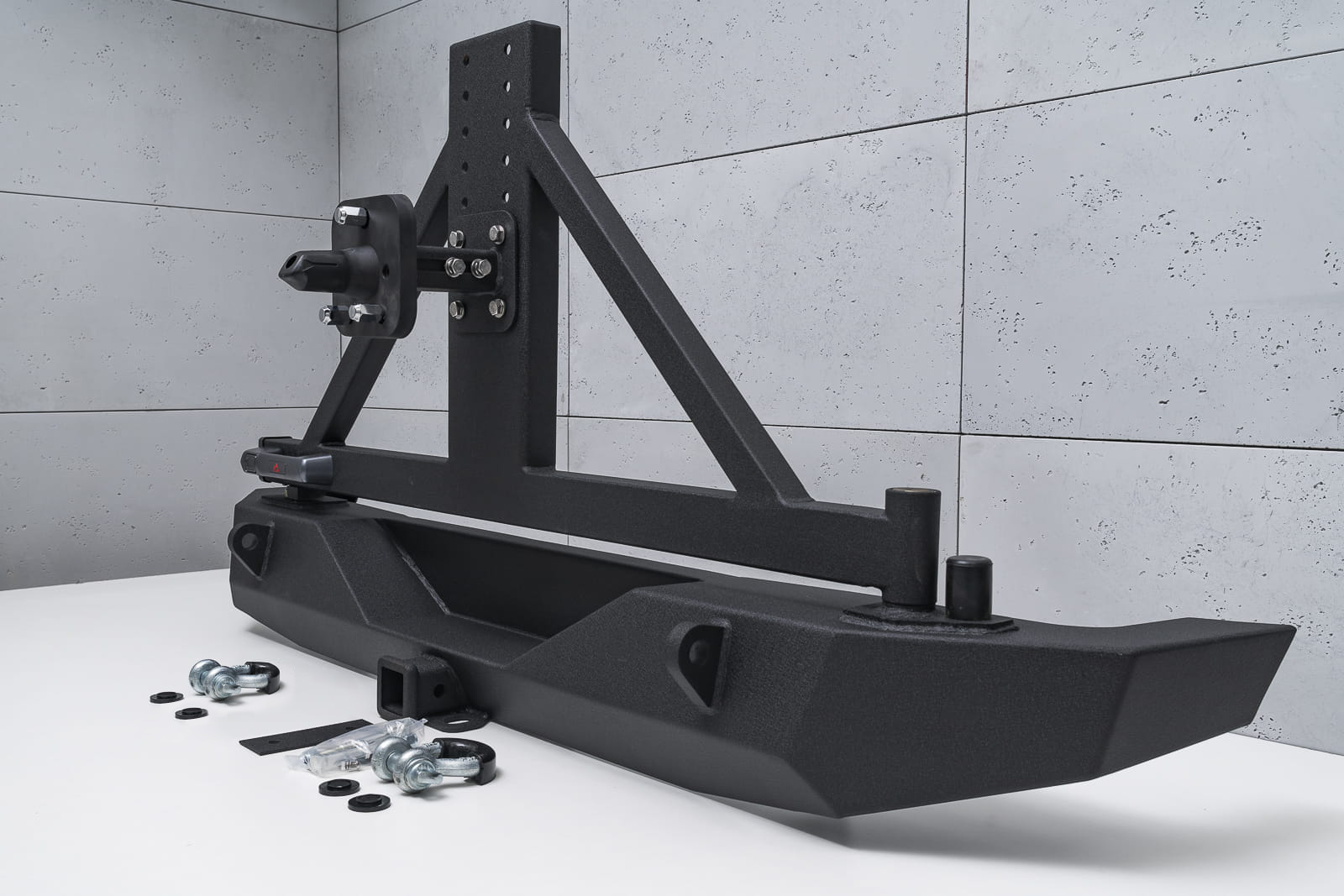Odporny na wszystko, co tylko stanie na jego drodze zderzak jest nie lada gratką dla entuzjastów off-roadu i stylistyki Wranglera. Doposażony w silne mocowania na szekle oraz specjalny uchwyt pozwalający zamocować hak. Ramię koła mocowane jest na zaczepie tylnego zderzaka, zamykanym stylową klamką nowego typu służącą do zdjęcia rygla otwierającego uchwyt koła zapasowego. Zderzak posiada stopniową regulację pod wielkość opony, nawet do 40 cali. Ramię jest dodatkowo wzmocnione, co pozwala na pewną jazdę również w terenie. Dodatkowo zderzak posiada specjalnie wyprofilowanie i osłonięte gniazdo przeznaczone pod kamerę cofania, która znajduje się w kole zapasowym.