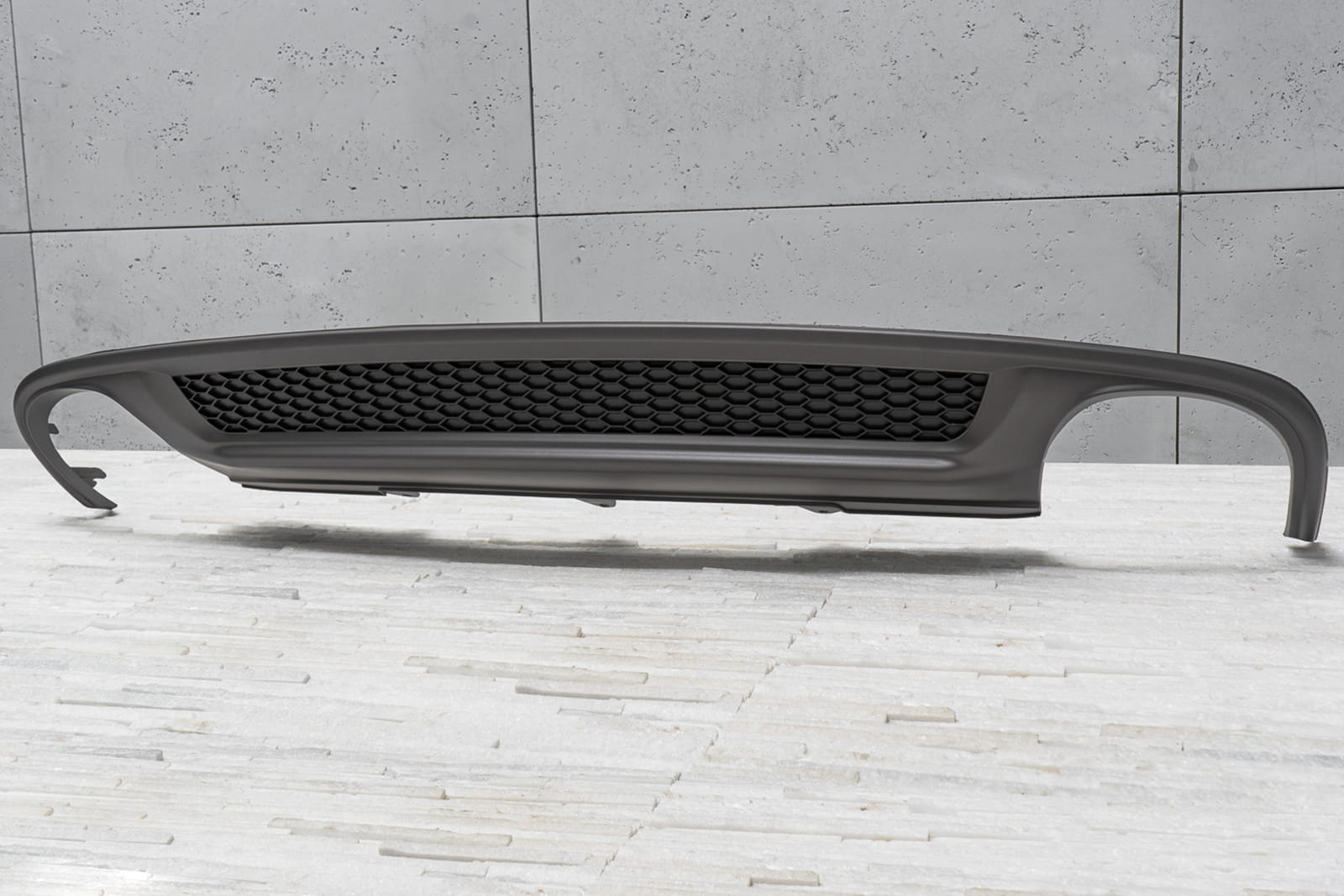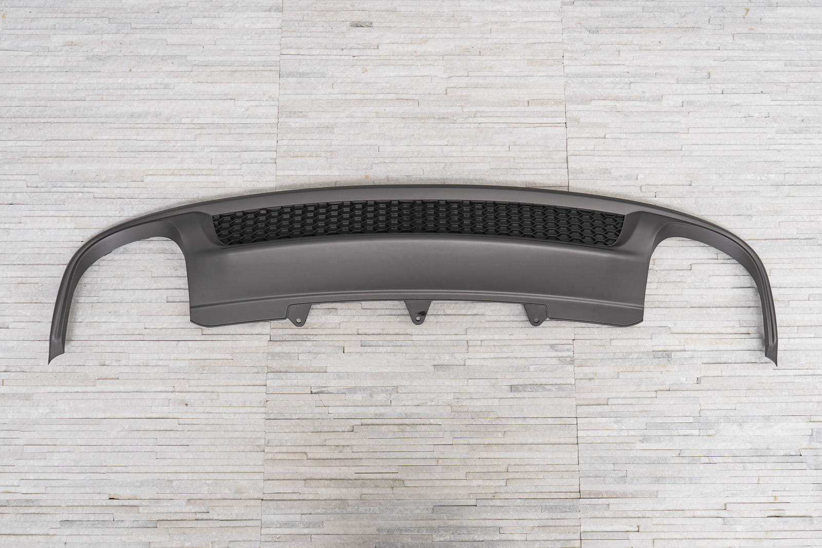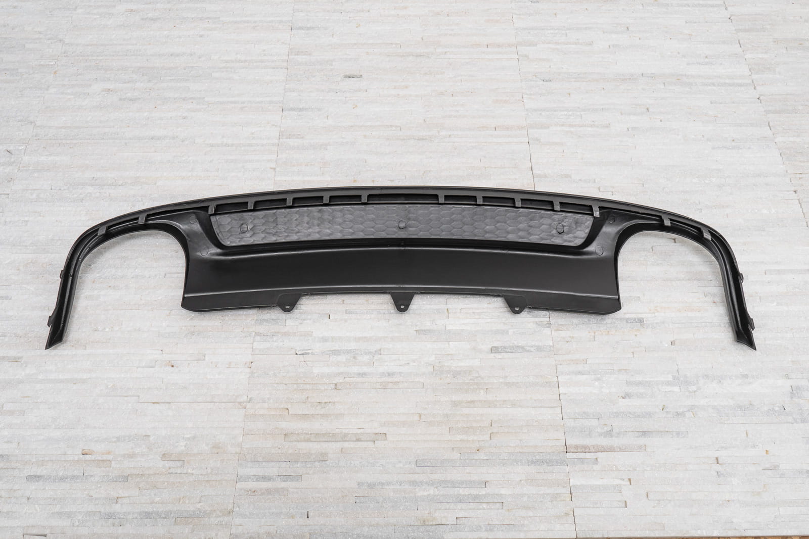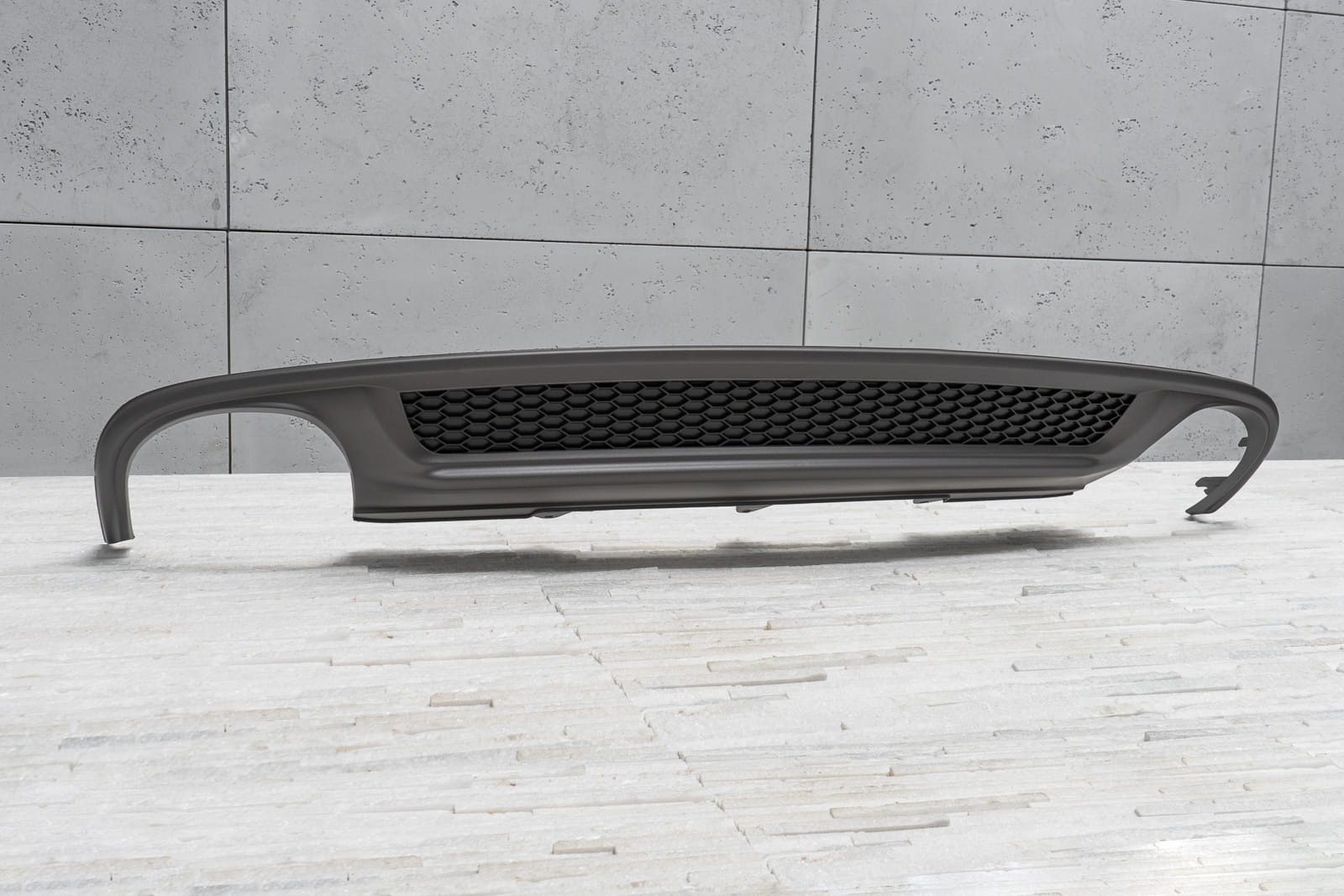 Dyfuzor tylnego zderzaka dla modelu AUDI A4 B8 2011-2015 (wersja po faceliftingu). Nie pasuje do wersji S / S-LINE / RS. Charakterystyczny, podwójny wydech pozwala osiągnąć efekt stylizacji Audi A4 na wersje S4.