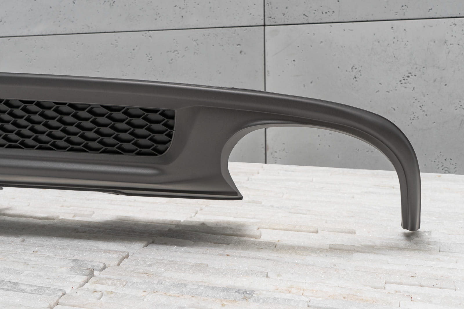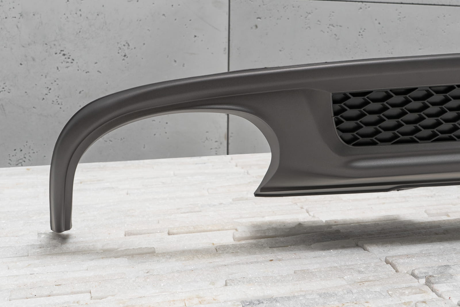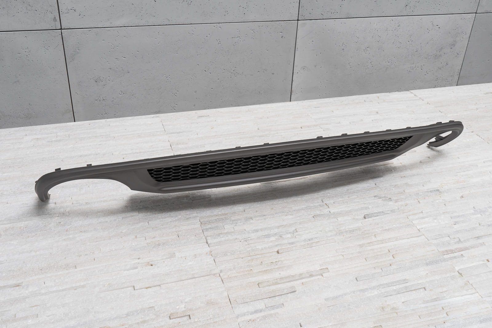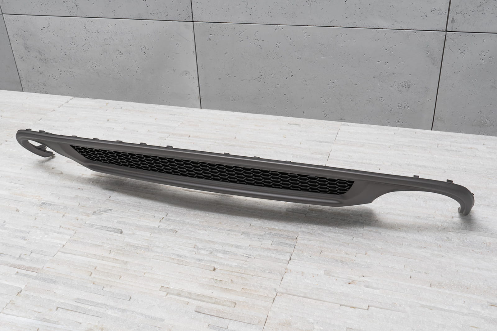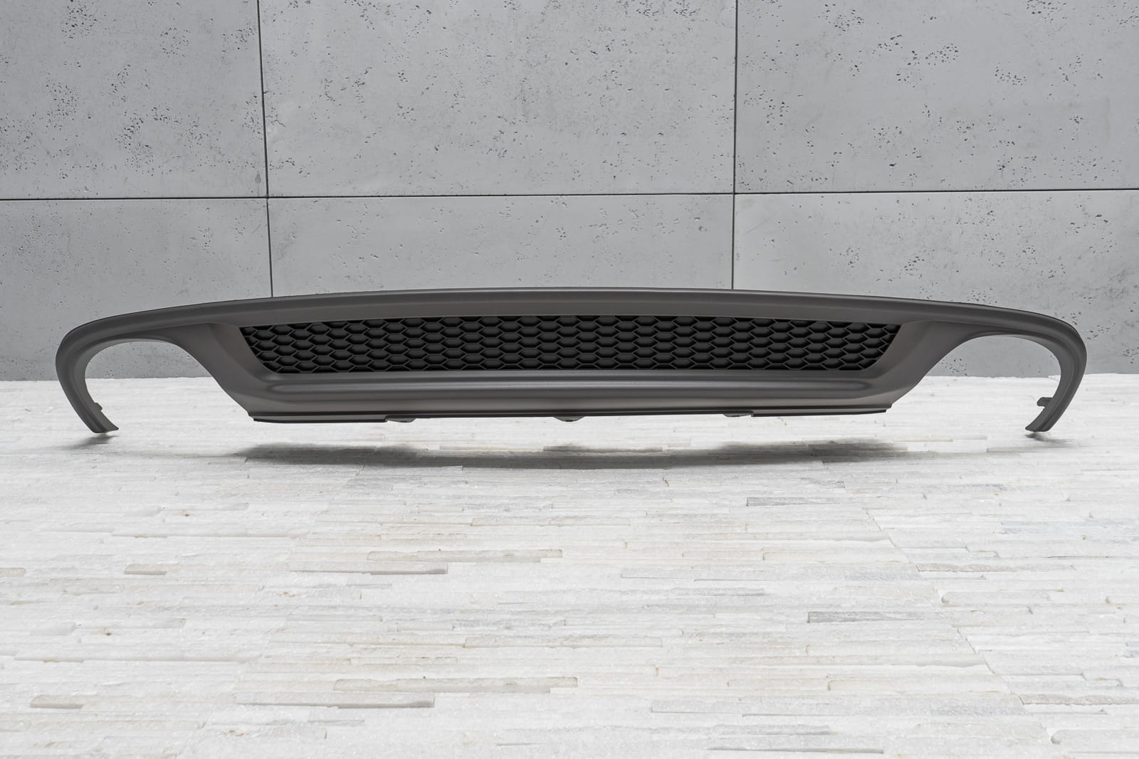 Dyfuzor tylnego zderzaka dla modelu AUDI A4 B8 2011-2015 (wersja po faceliftingu). Nie pasuje do wersji S / S-LINE / RS. Charakterystyczny, podwójny wydech pozwala osiągnąć efekt stylizacji Audi A4 na wersje S4.