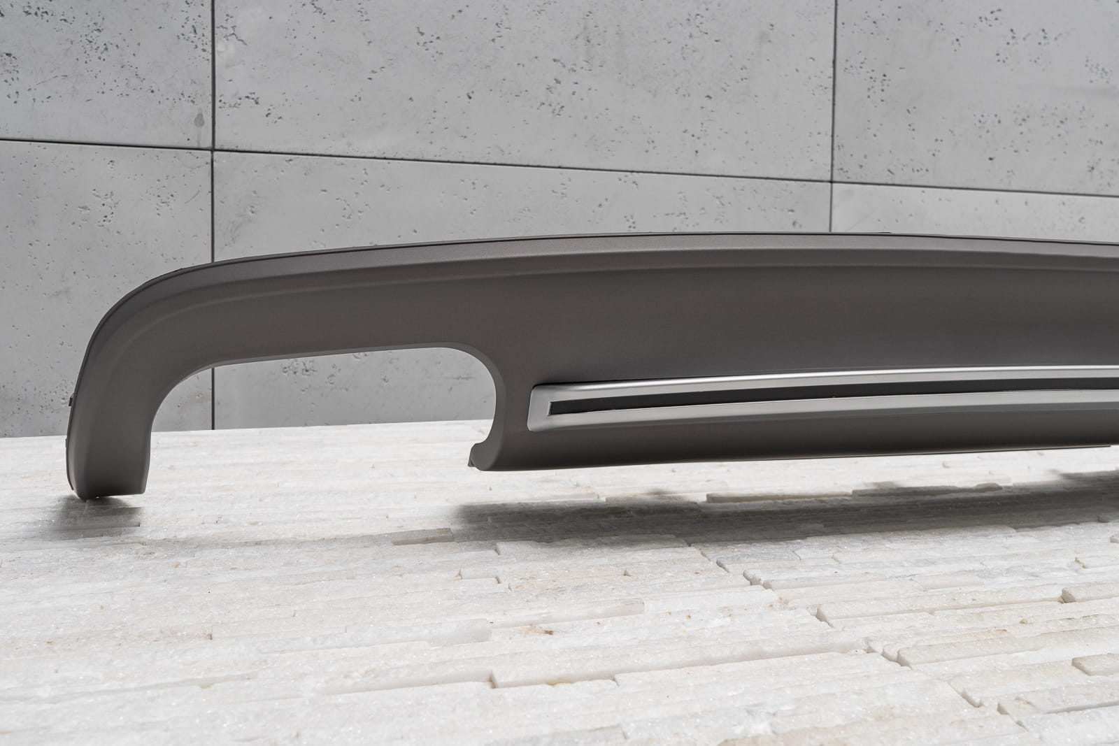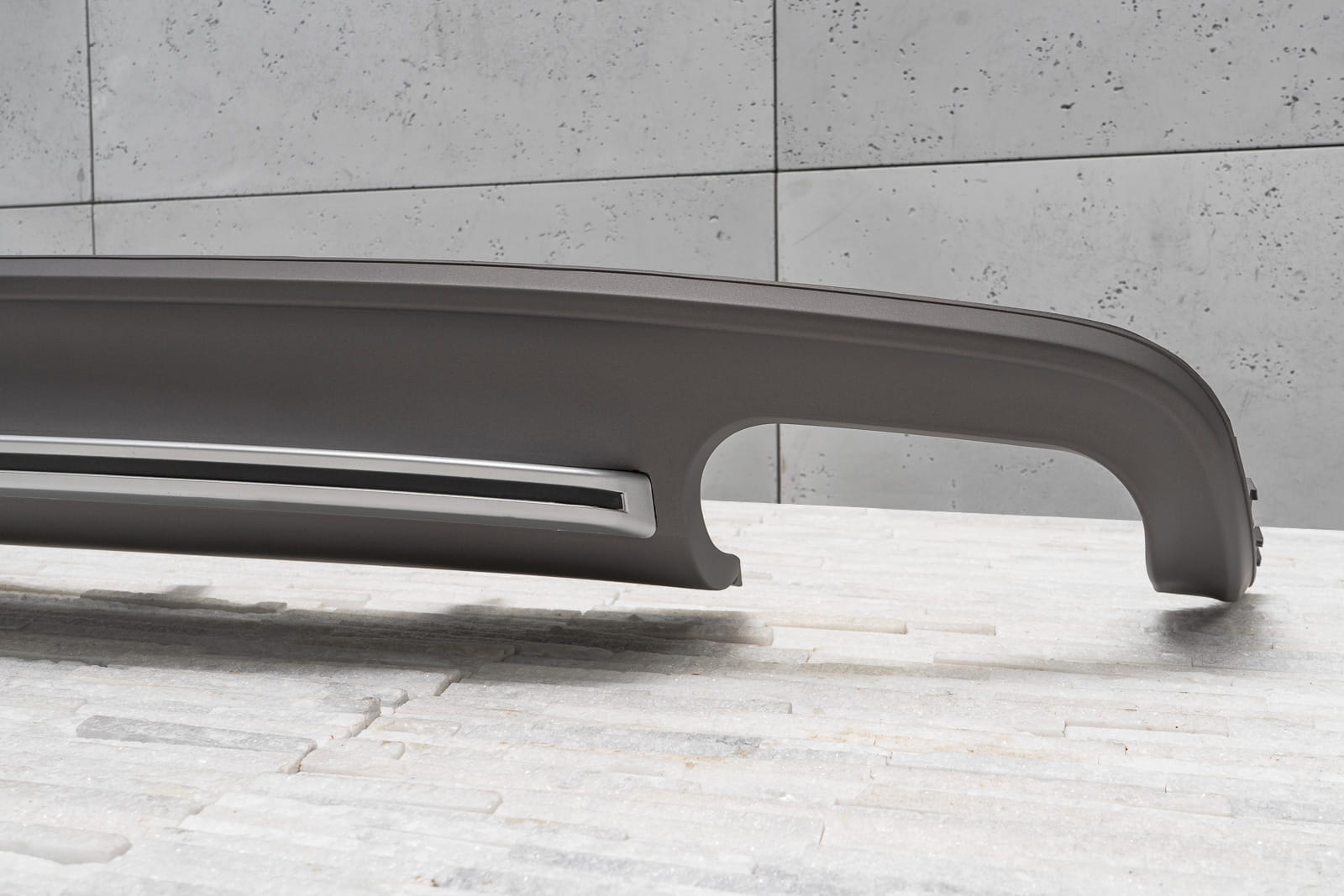 Produkt wykonany został z wysokiej jakości tworzywa motoryzacyjnego ABS w kolorze antracytu. Prawdziwą ozdobą dyfuzora jest srebrna listwa z czarnym paskiem która przyciąga wzrok oraz podkreśla tył naszego auta.