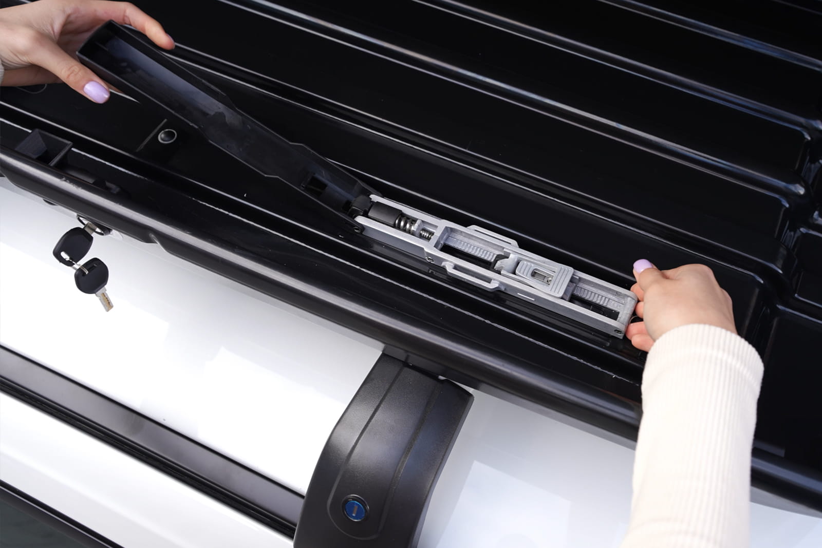 Montaż boksu jest bardzo prosty - wystarczy przymocować kufer do belek dachowych, używając uchwytów. Dzięki specjalnemu systemowi szybkiego montażu QAS (Quick Attachment System), założenie boksu trwa kilka sekund. Wystarczy umieścić mocowanie w odpowiednim miejscu, dosunąć szczęki do granicy belki. Zamknięcie pokrywy mocowania sprawia, że szczęki mocniej zacisną się na belkach. Dopasowany kształt mocowań nie ogranicza miejsca wewnątrz boksu. Maksymalna szerokość belki, do której można zamocować box to 80 mm. Mocowanie wykonano z najwyższej jakości aluminium. W zestawie znajduje się komplet 4 aluminiowych mocowań QAS o wartości 589 zł GRATIS.