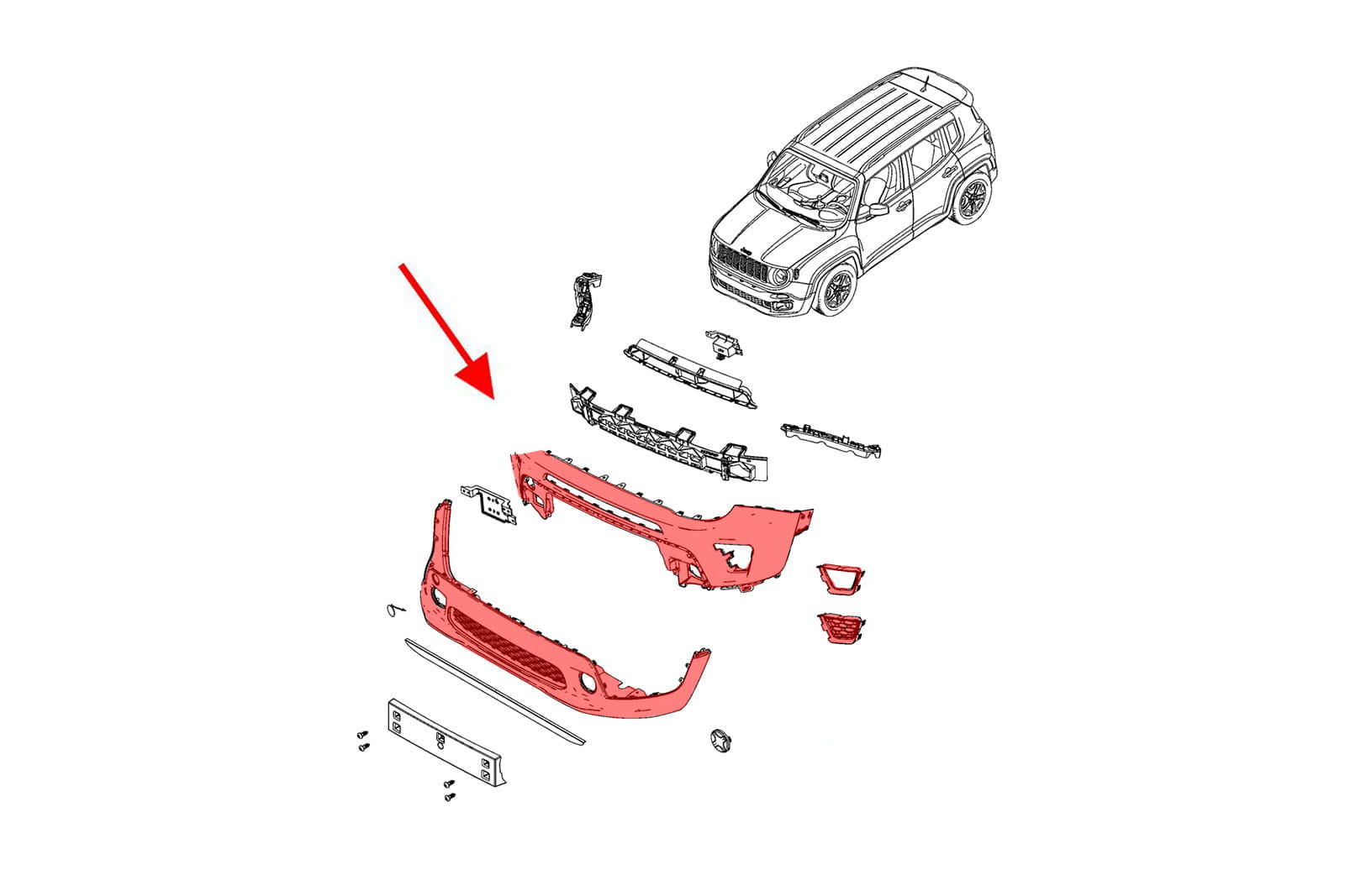 Kompletny zderzak przedni, dedykowany dla JEEP RENEGADE I (BU) 2018-2022 (wersja po faceliftingu).