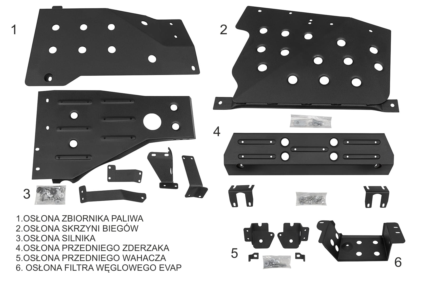 Oferowany zestaw stanowi kompleksową ochronę przed uszkodzeniem podwozia naszego samochodu, w szczególności silnika oraz skrzyni biegów, zwłaszcza w trakcie jazdy w terenie. Wytrzymały zestaw osłon jest nieodzownym elementem wyposażenia samochodu każdego miłośnika off-roadu. Dedykowane osłony pełnią rolę ochronną, ograniczając ryzyko mechanicznego uszkodzenia silnika, skrzyni biegów samochodu czy wahacza przez kamienie itp. Osłony pasują do wahaczy standardowych i regulowanych. Jednocześnie osłony są tak zaprojektowane, że po zamontowaniu nadal mamy wygodny dostęp do wahacza, więc przy rutynowej konserwacji, nie ma potrzeb ich demontowania. Produkty został wykonane ze stali walcowanej na zimno o grubości 3 mm, zabezpieczonej w dwustopniowym procesie malowania z użyciem wstępnej warstwy epoksydowej. Tak powstała struktura zapewnia nie tylko trwałość, ale także estetyczny wygląd elementu przez długi czas. Osłony montowane są w fabrycznie przygotowane dla nich miejsca w podwoziu Wranglera. Nie wymagają wiercenia.