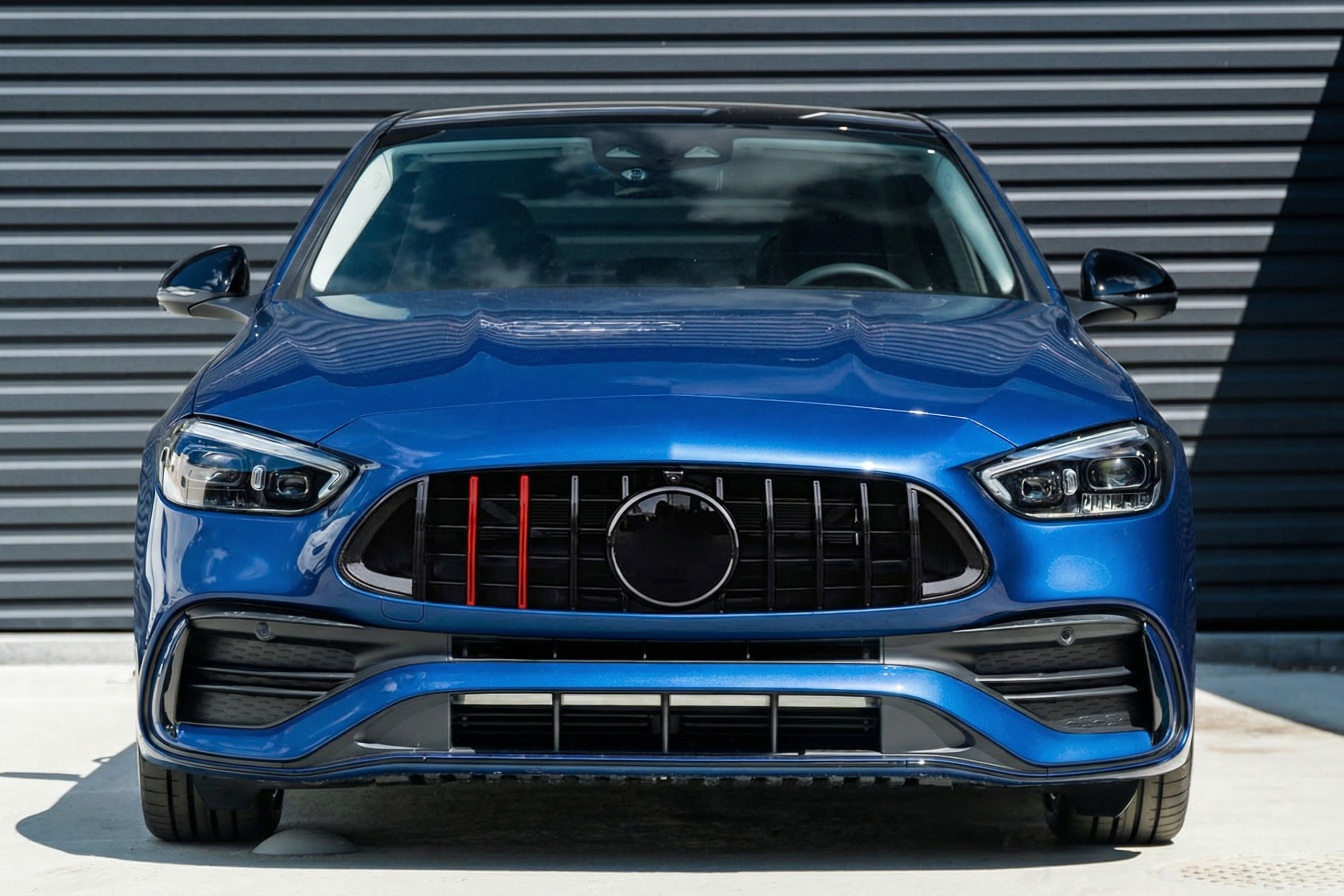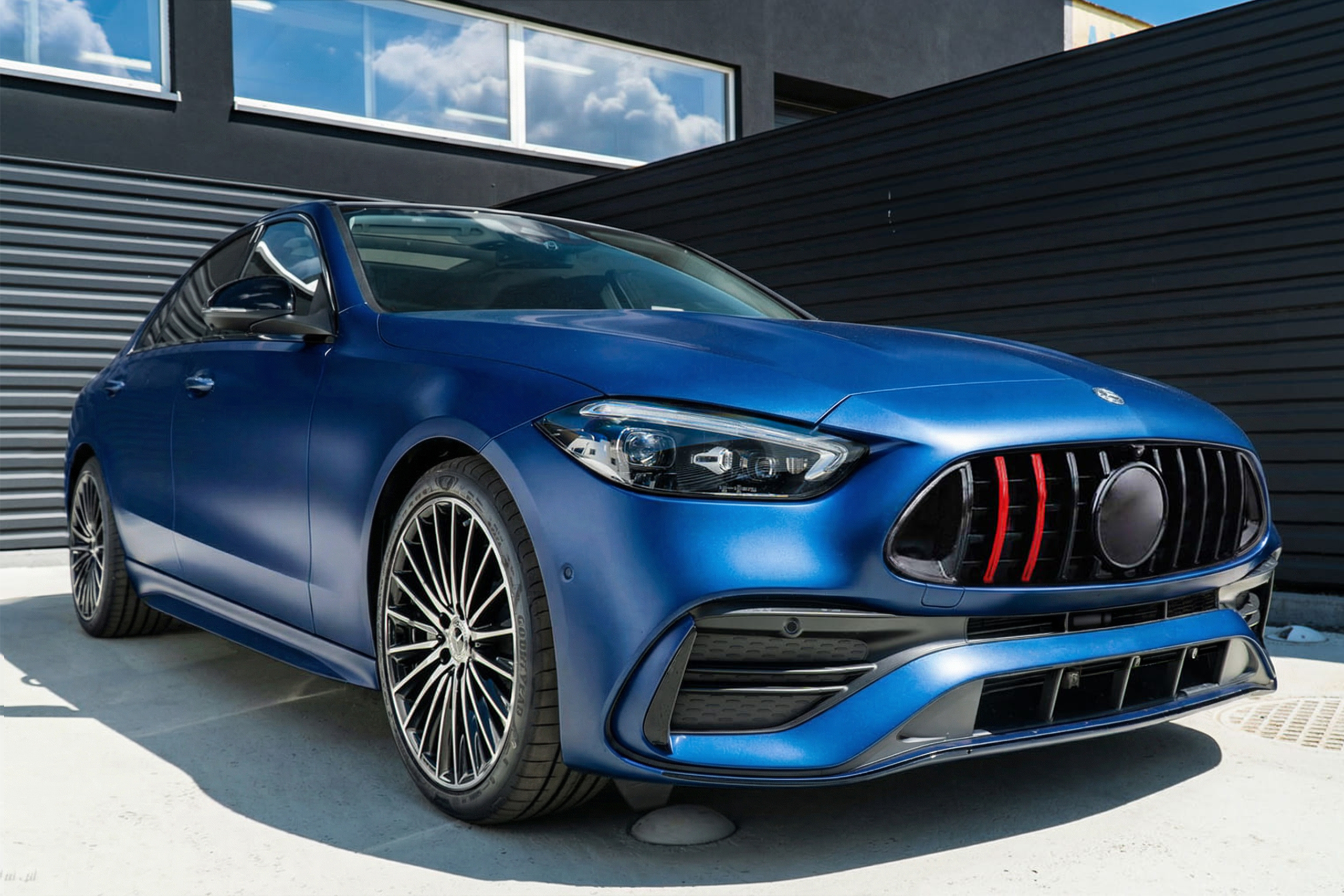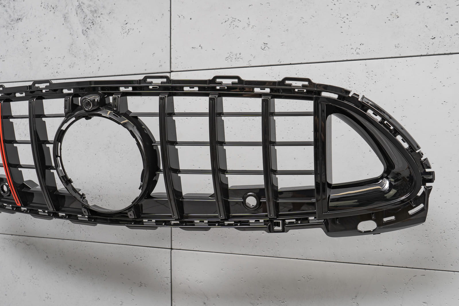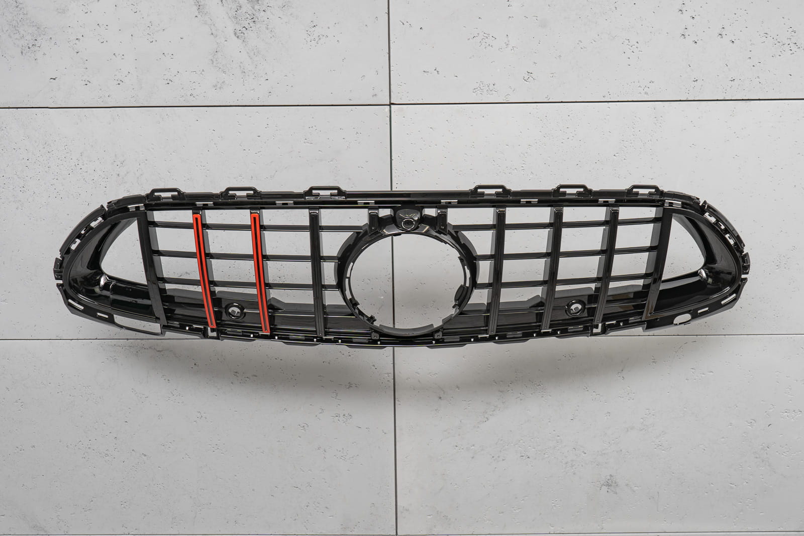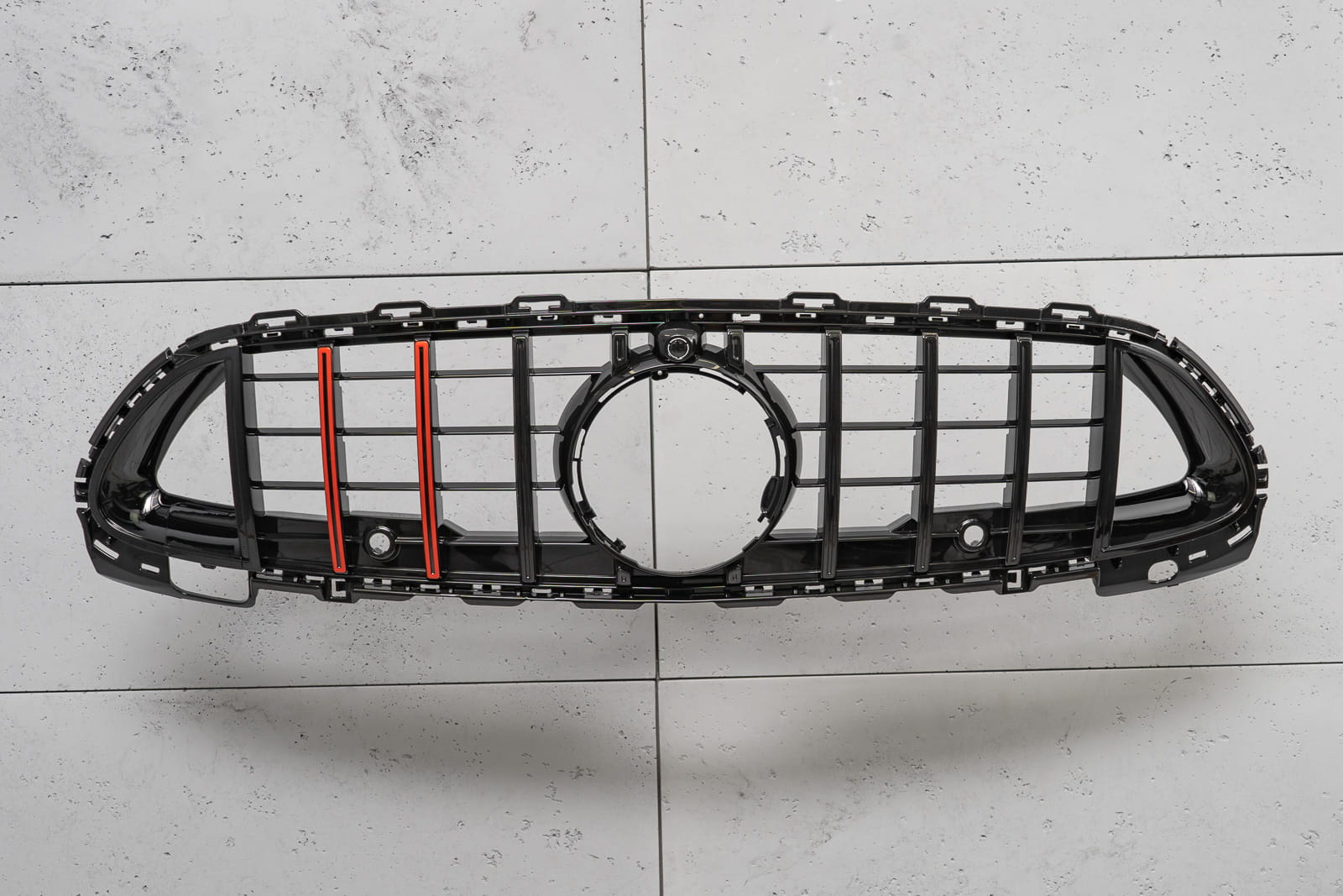 Dedykowany grill zaprojektowany został w stylu charakterystycznym dla samochodów z segmentu GT. Kratka grilla ozdobiona została szerokimi czarnymi poprzeczkami, które nieodzownie przywodzą na myśl budzące respekt, pełne mocy samochody z najwyższej półki. Element zachwyca sportowym stylem, doskonale współgrając z imponującym designem Mercedesa.