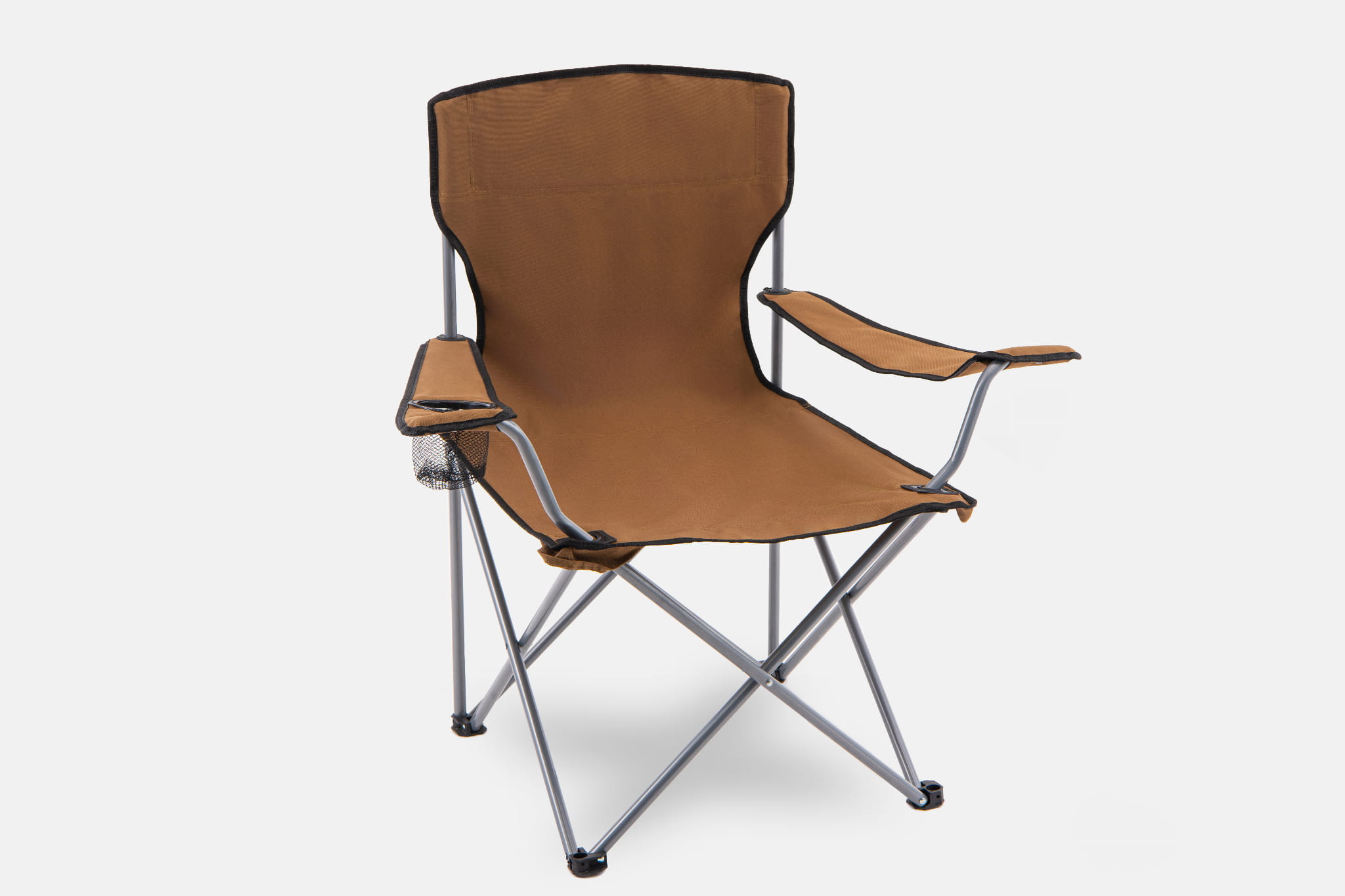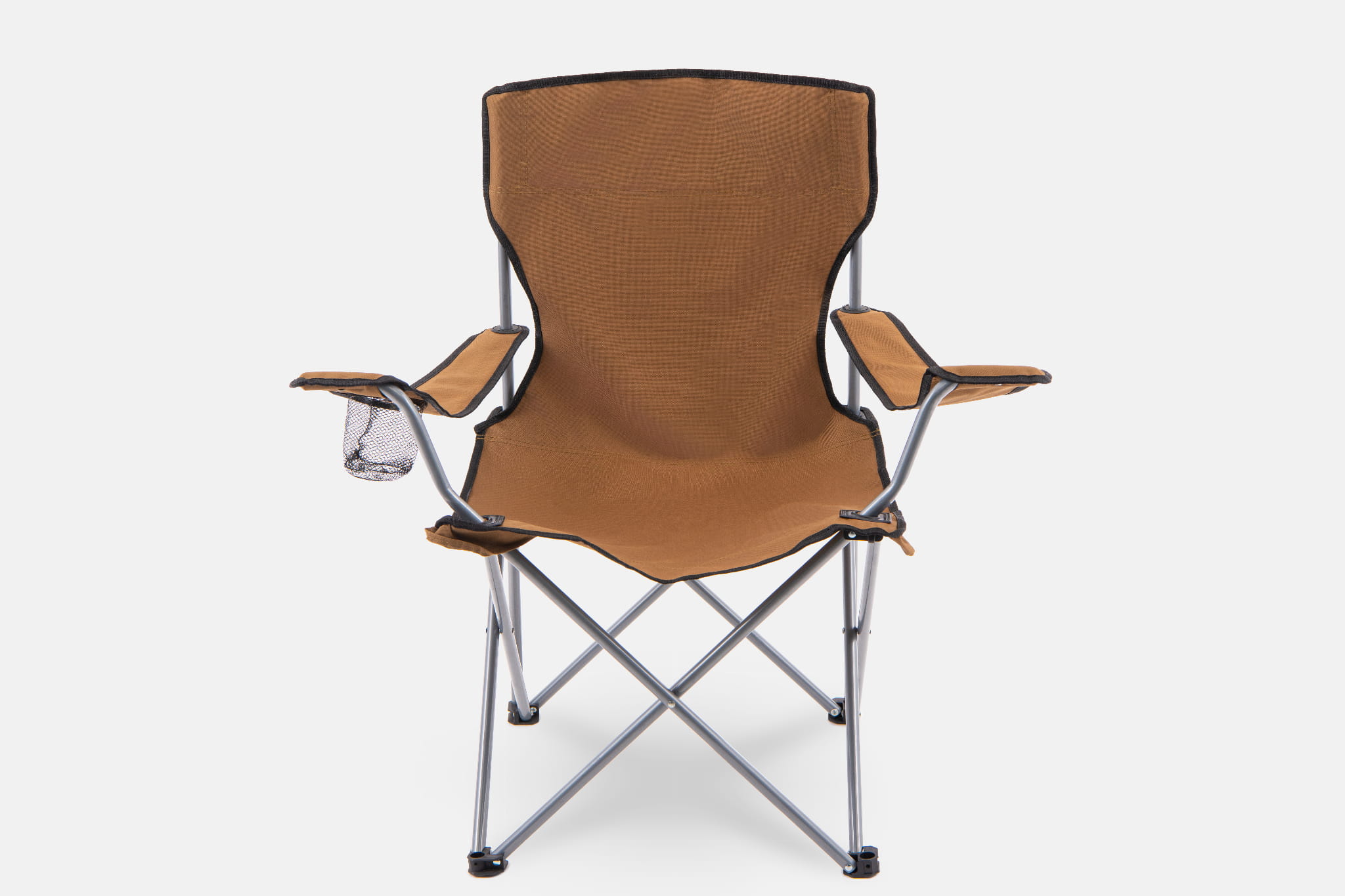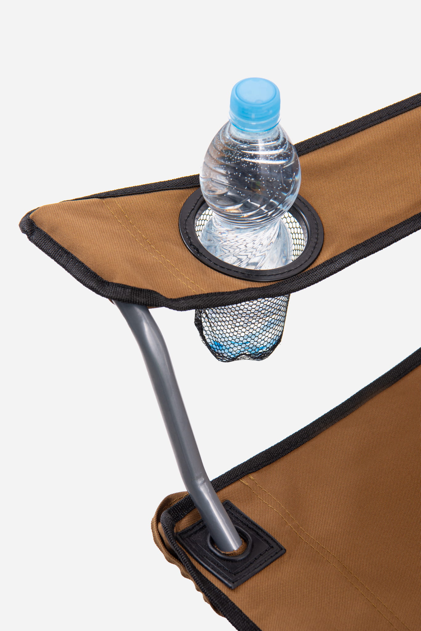 Składane, komfortowe krzesło turystyczne z uchwytem na butelkę w kolorze brązowym. Towar poekspozycyjny! Zdjęcia przedstawiają faktyczny stan produktu.