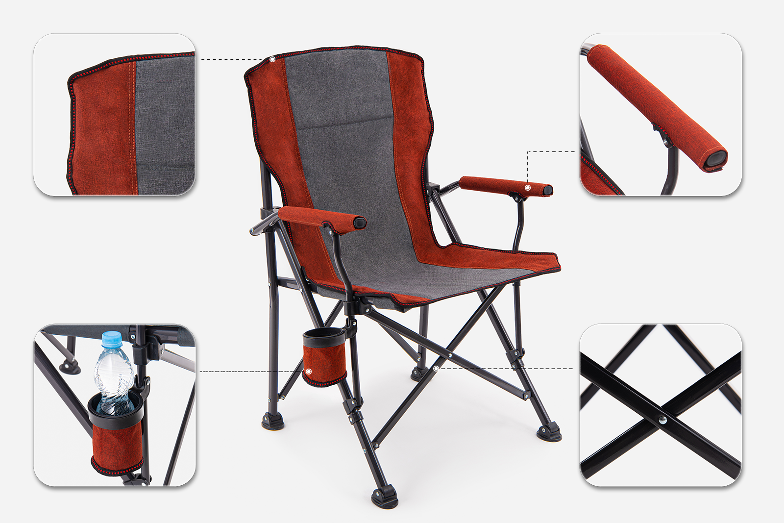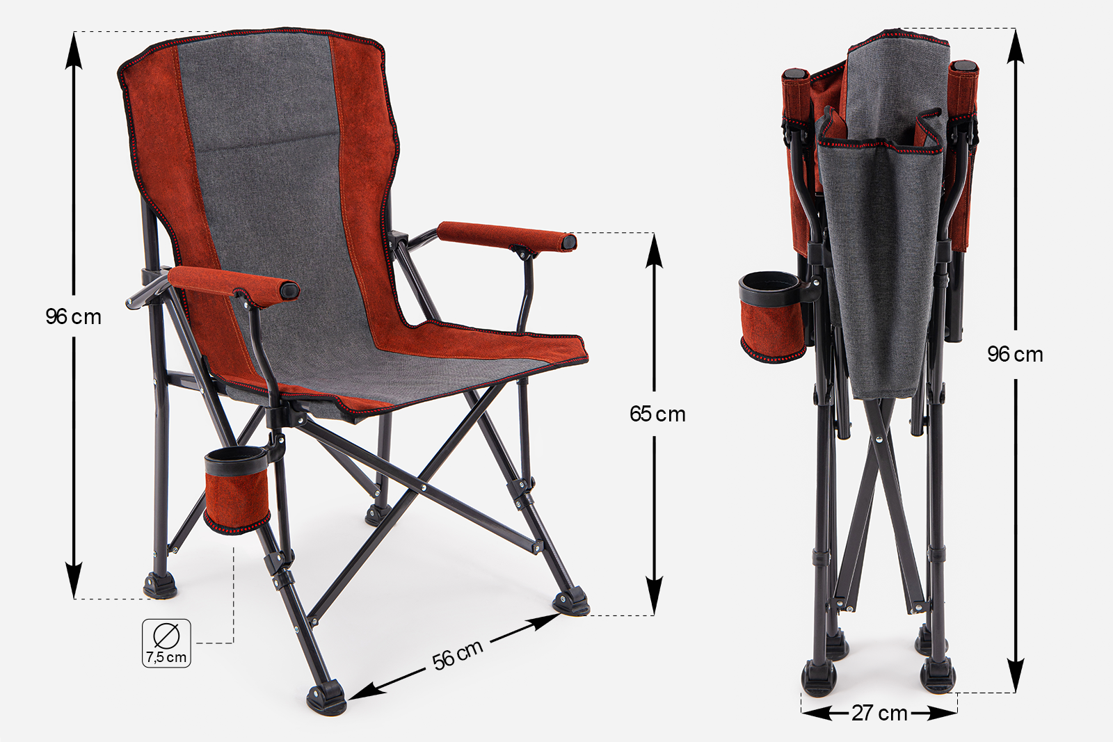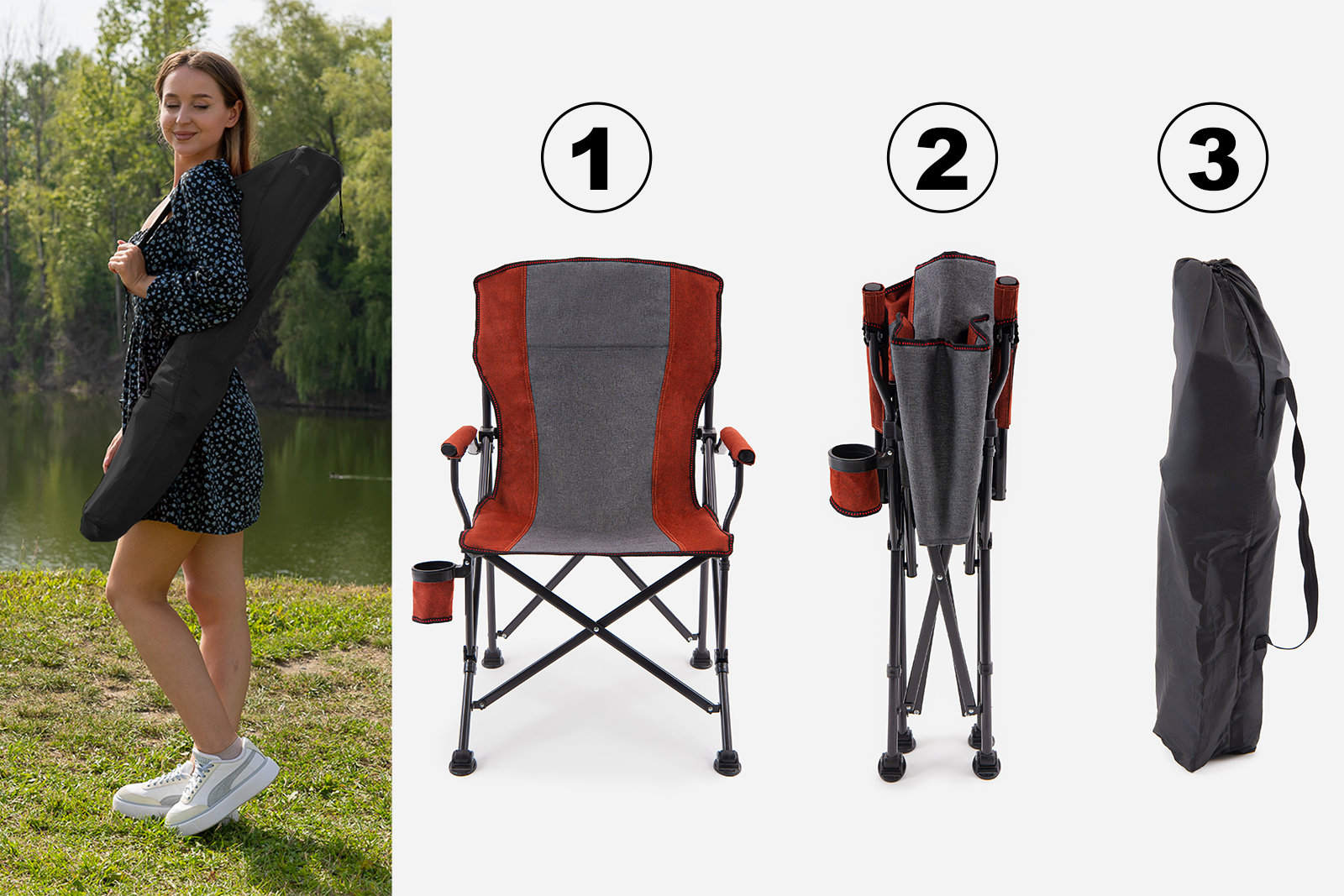 Składane, komfortowe krzesło turystyczne z uchwytem na butelkę.