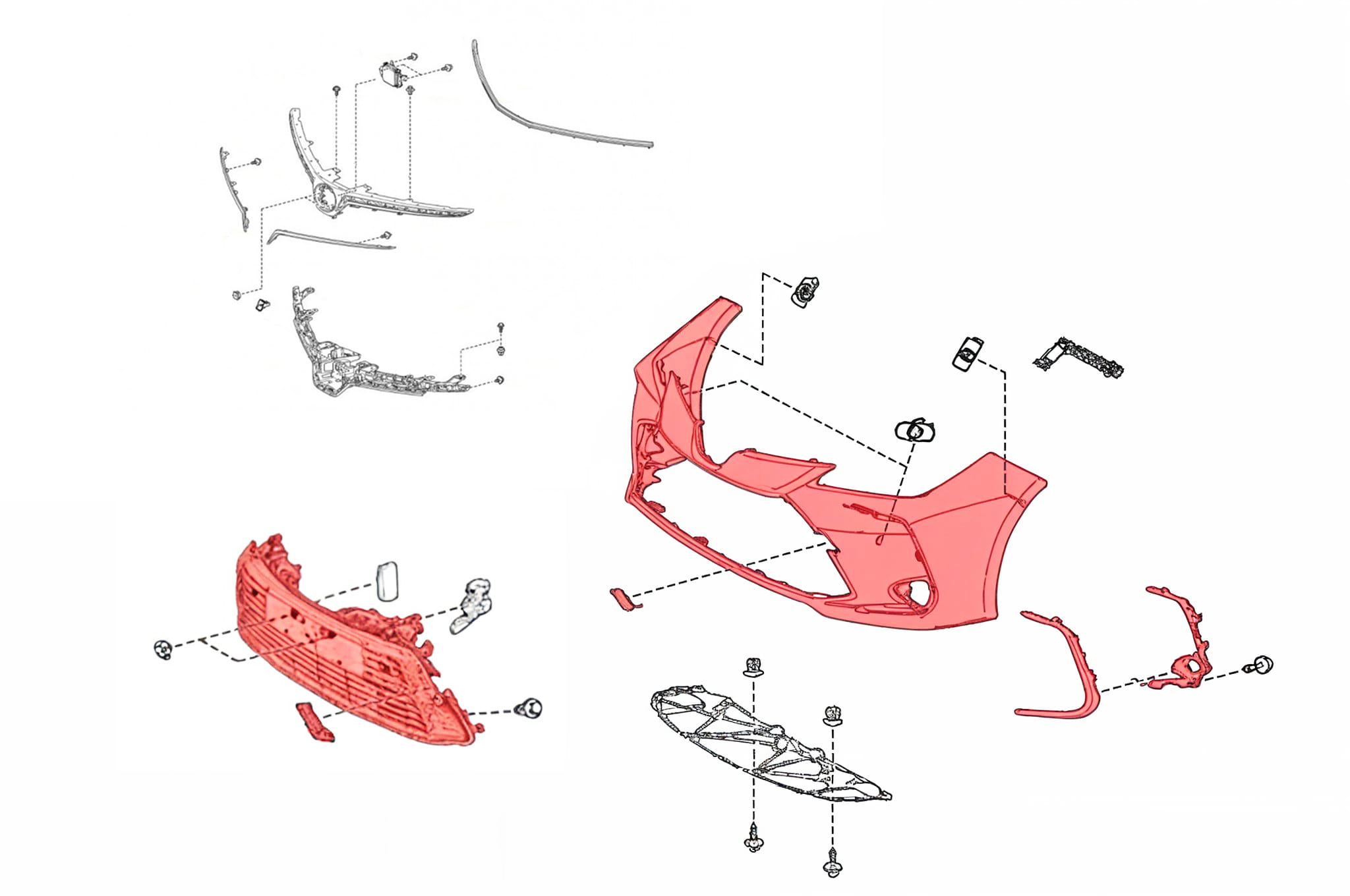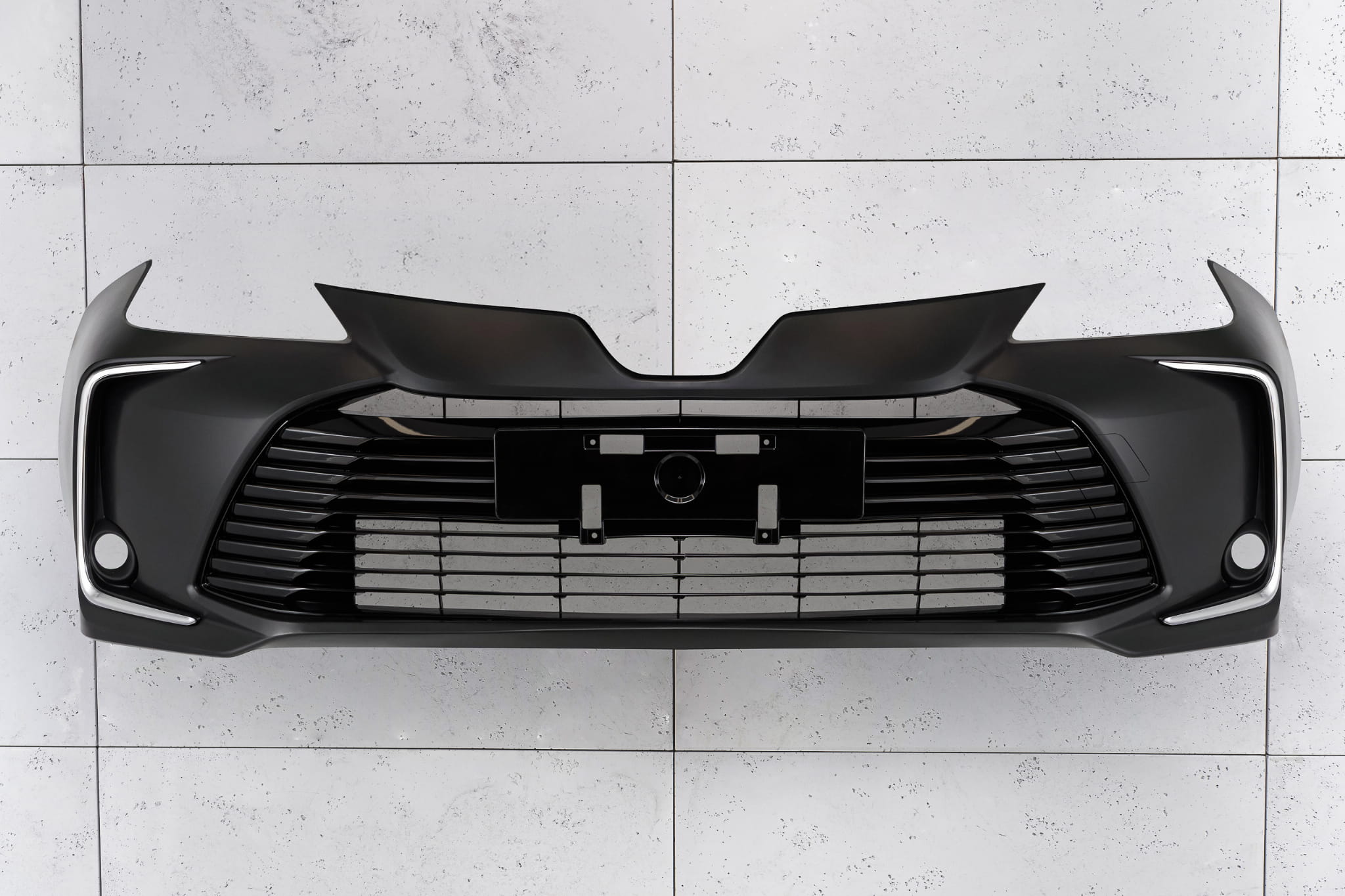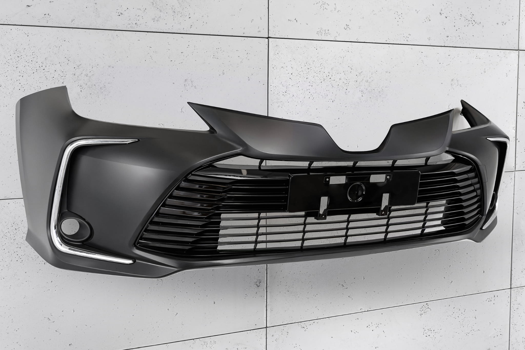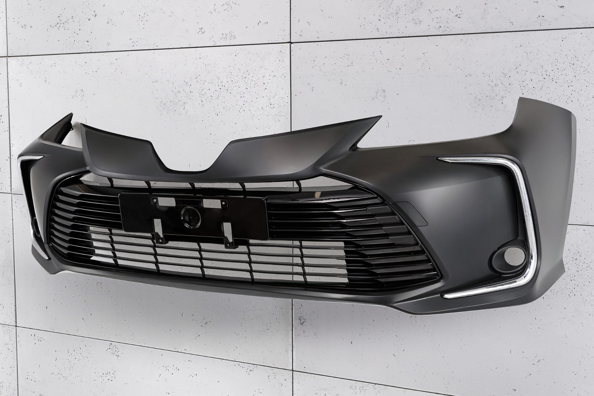 Zestaw: zderzak przedni z kratkami halogenów i grillem dolnym, dedykowany dla TOYOTA COROLLA XII (E21) 2019+ (w wersji SEDAN). Wersja bez otworów pod czujniki parkowania PDC i otworów pod spryskiwacze. Pasuje zarówno do wersji przed, jak i po faceliftingu.