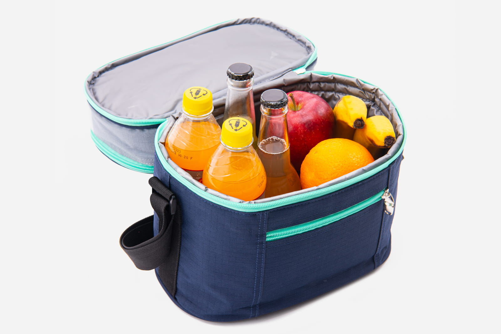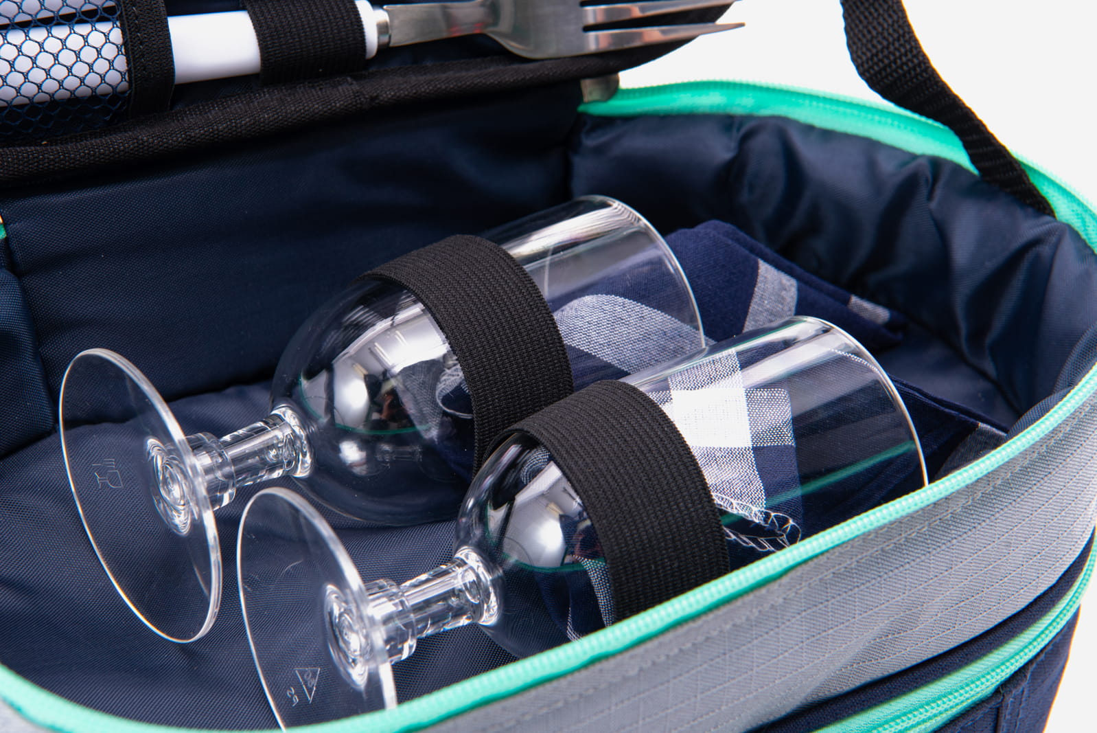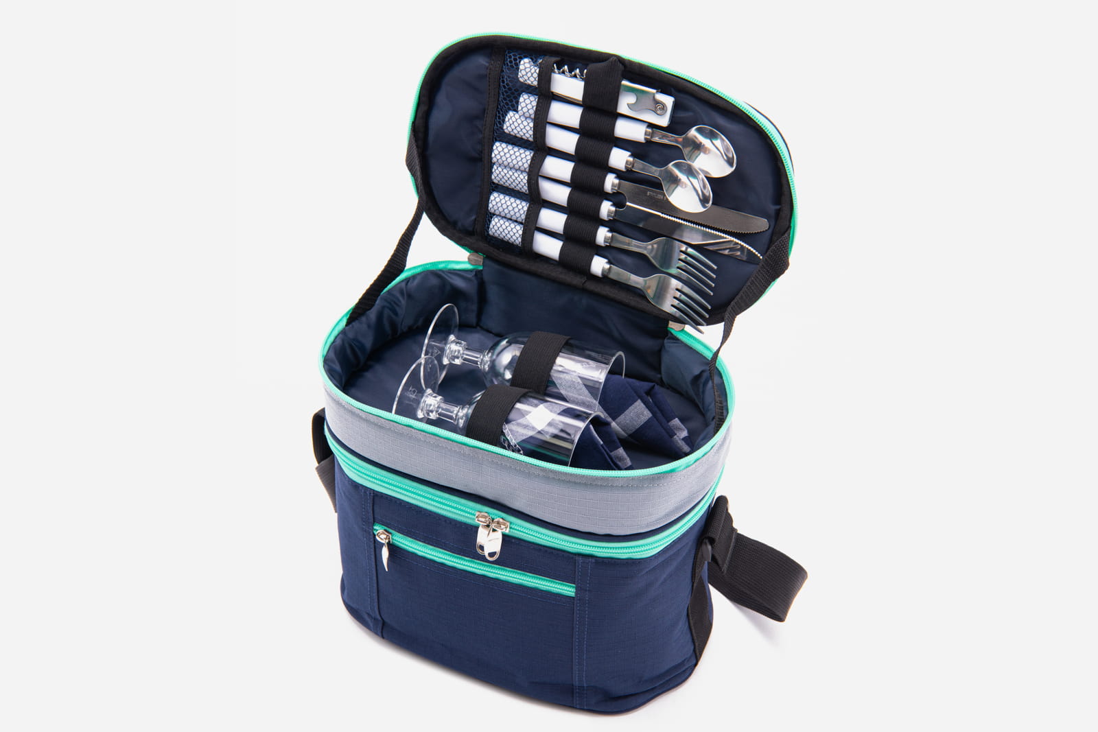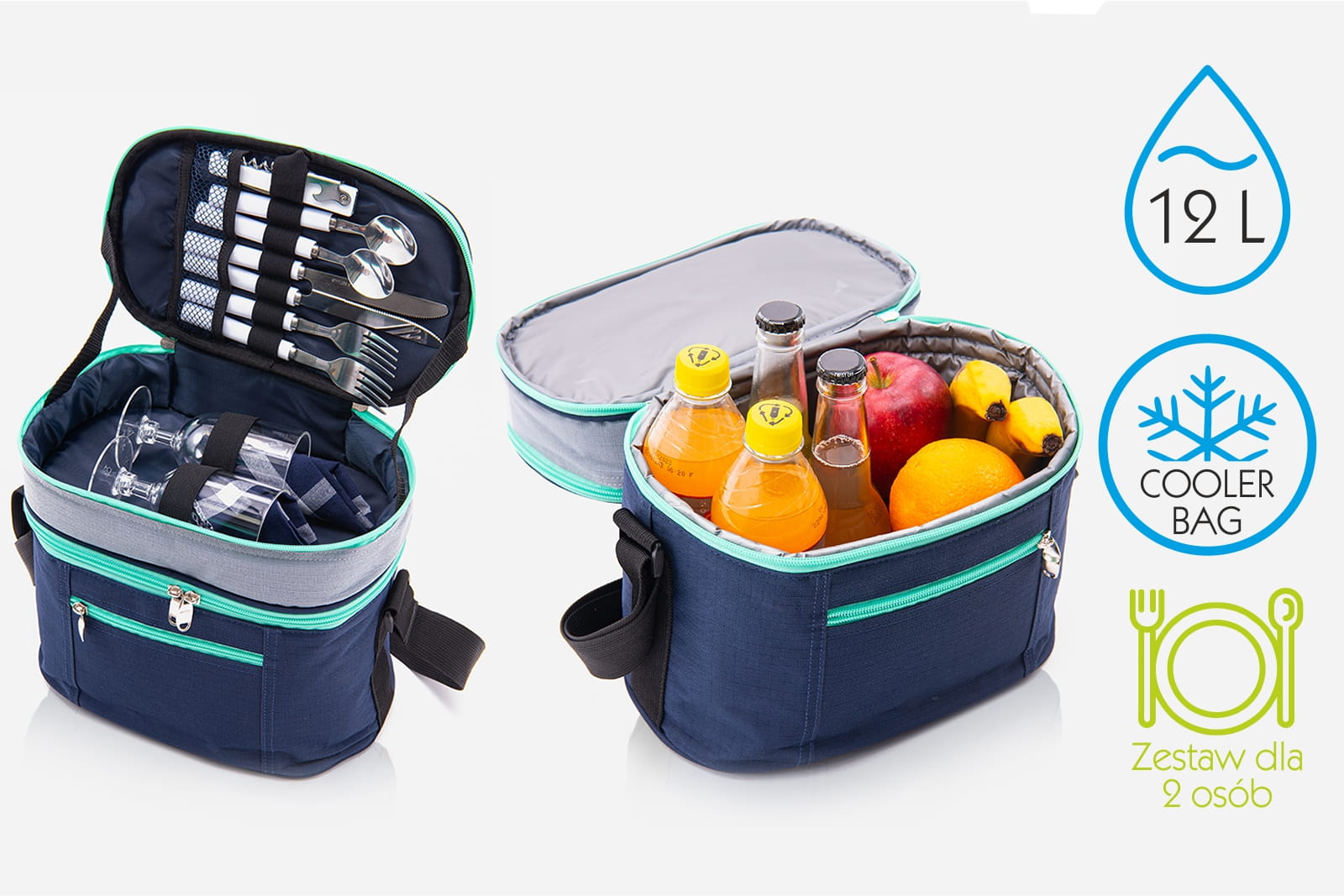 Turystyczna, izolowana torba chłodząca, CoolerBag, o pojemności 12 litrów z wyposażeniem dla dwóch osób.