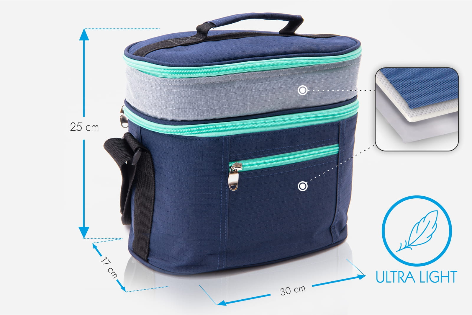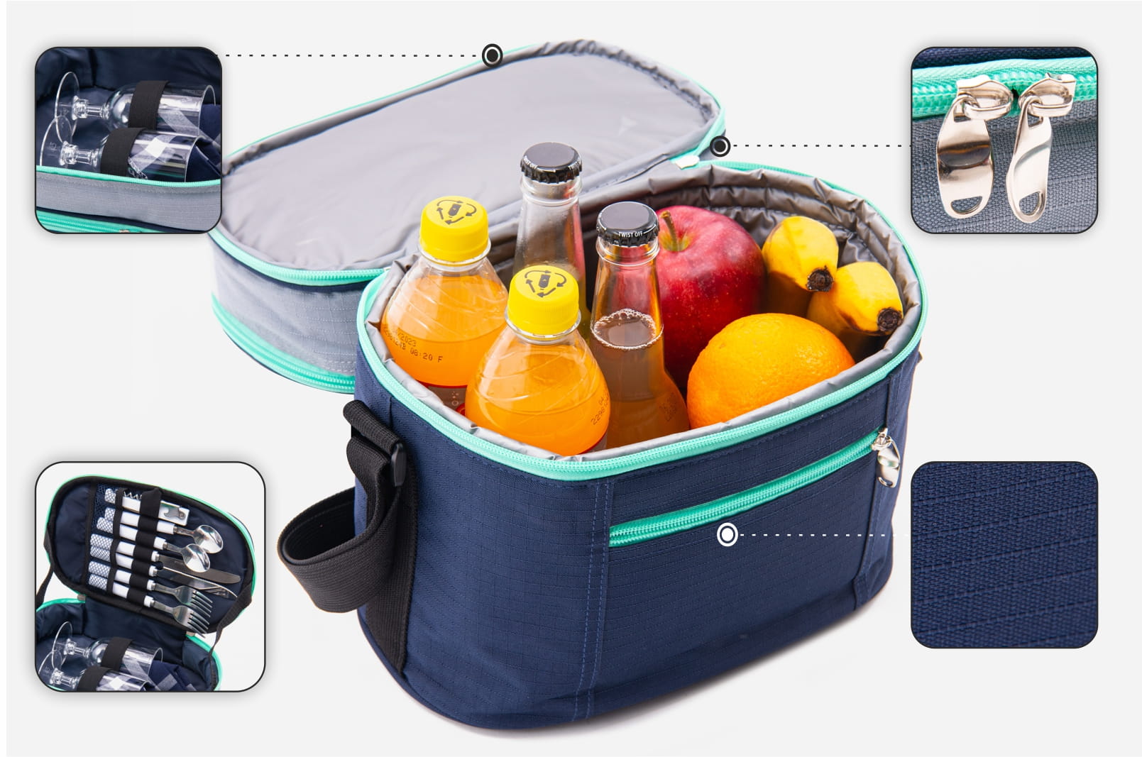 Turystyczna torba chłodząca to idealny wybór na piknik, wakacje, wyjście do parku, czy na grill. Torba charakteryzuje się bardzo dobrą izolacją cieplną. Wysokiej jakości materiał PEVA zapewnia doskonałą odporność na ciepło, dzięki czemu żywność i napoje pozostaną świeże, chłodne lub ciepłe przez kilka godzin. Torba posiada dwie komory, każda z nich zasuwana jest na zamek błyskawiczny. Pierwsza komora wyposażona została w zestaw sztućców, otwieracz do wina oraz kieliszki dla dwóch osób. Druga komora jest to miejsce do przechowywania żywności oraz napojów. Mała kieszonka, która znajduje się na przodzie torby idealnie sprawdzi się do przechowywania np. dokumentów, kluczy czy telefonu. Produkt wyposażony jest także w wygodną rączkę dla łatwiejszego przenoszenia torby oraz dodatkowy pasek naramienny.