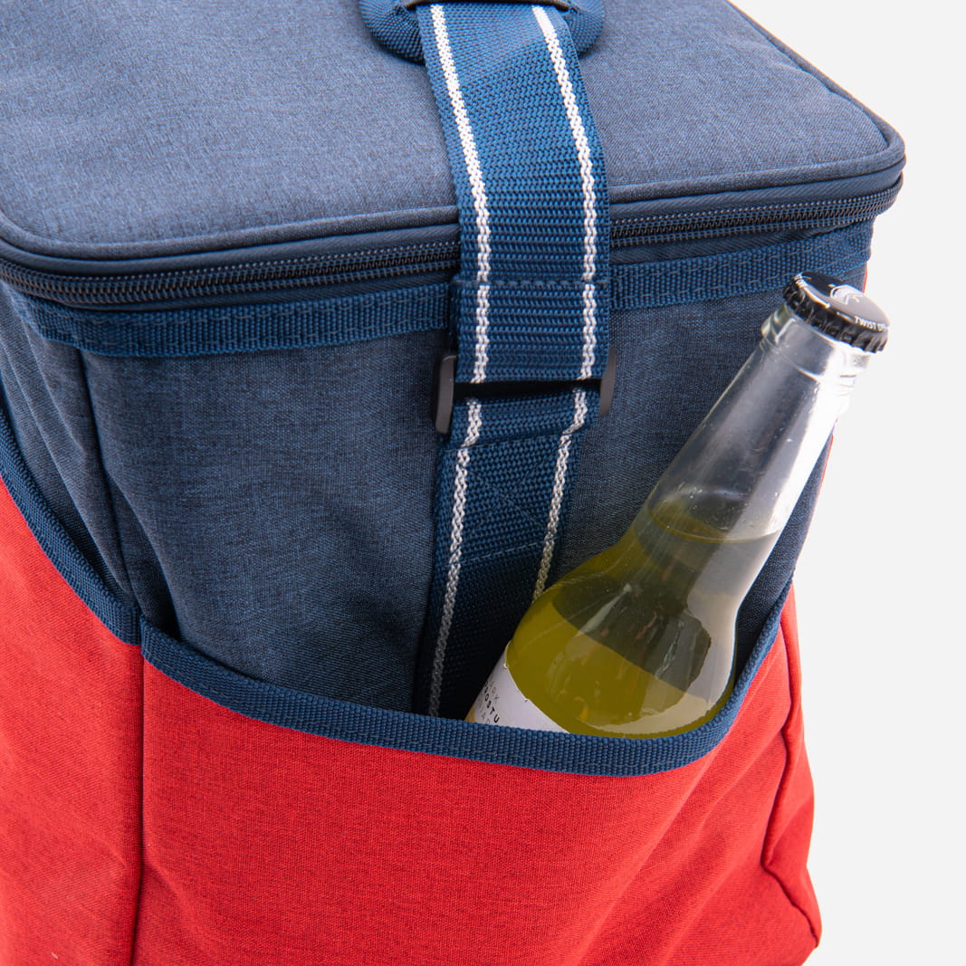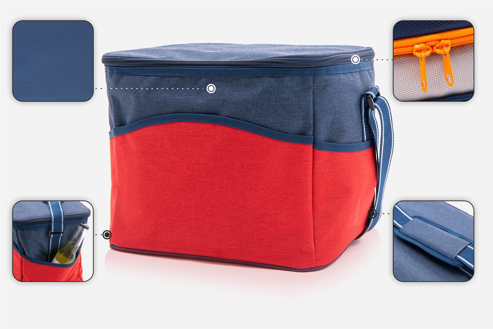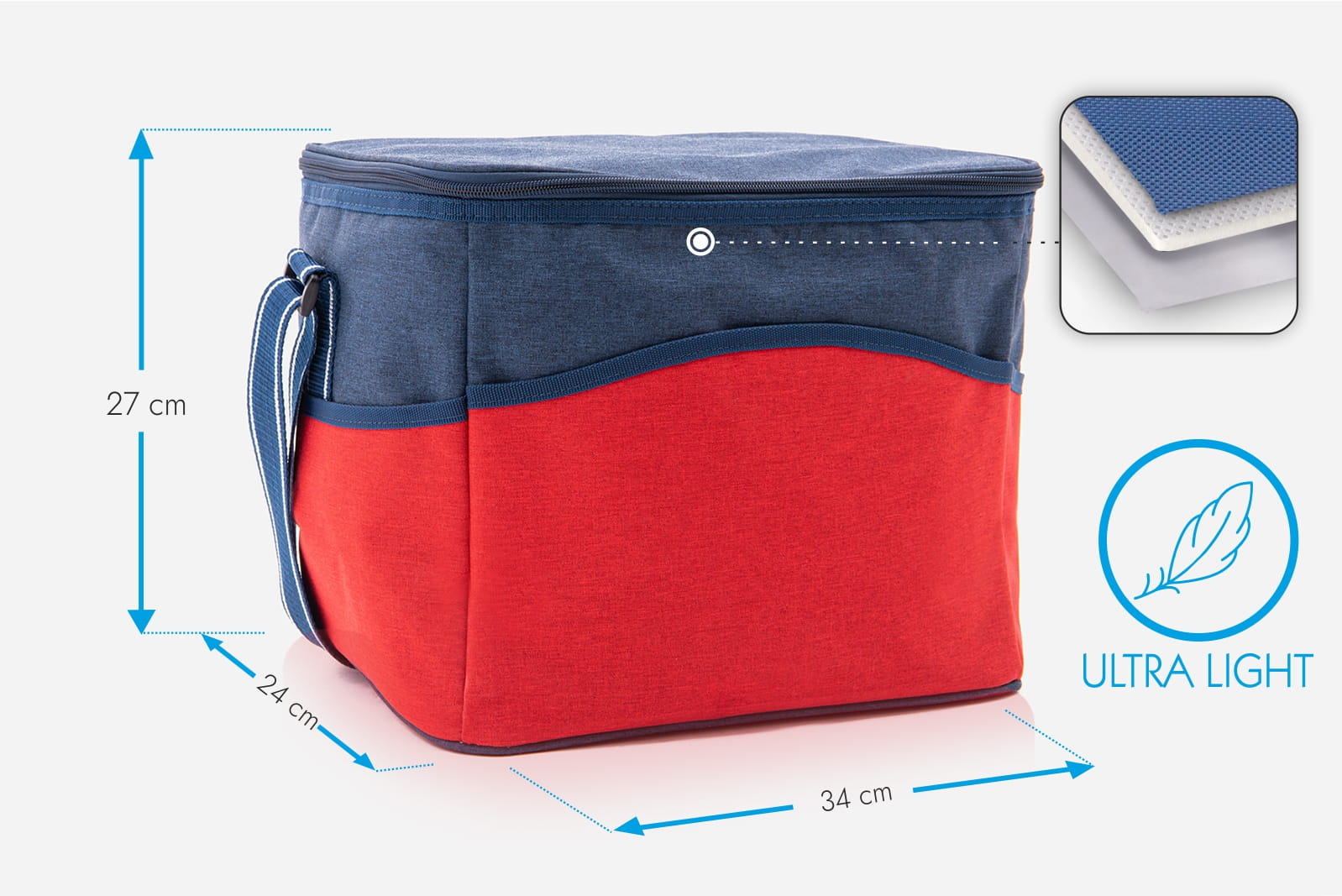 Turystyczna torba chłodząca to idealny wybór na kemping, wakacje, wyjście do parku, czy na grill. Torba charakteryzuje się bardzo dobrą izolacją cieplną. Wysokiej jakości materiał PEVA zapewnia doskonałą odporność na ciepło, dzięki czemu żywność i napoje pozostaną świeże, chłodne lub ciepłe przez kilka godzin. Po stronie zewnętrznej umieszczono kieszenie na drobiazgi zamykane na rzep oraz regulowany pasek na ramię.