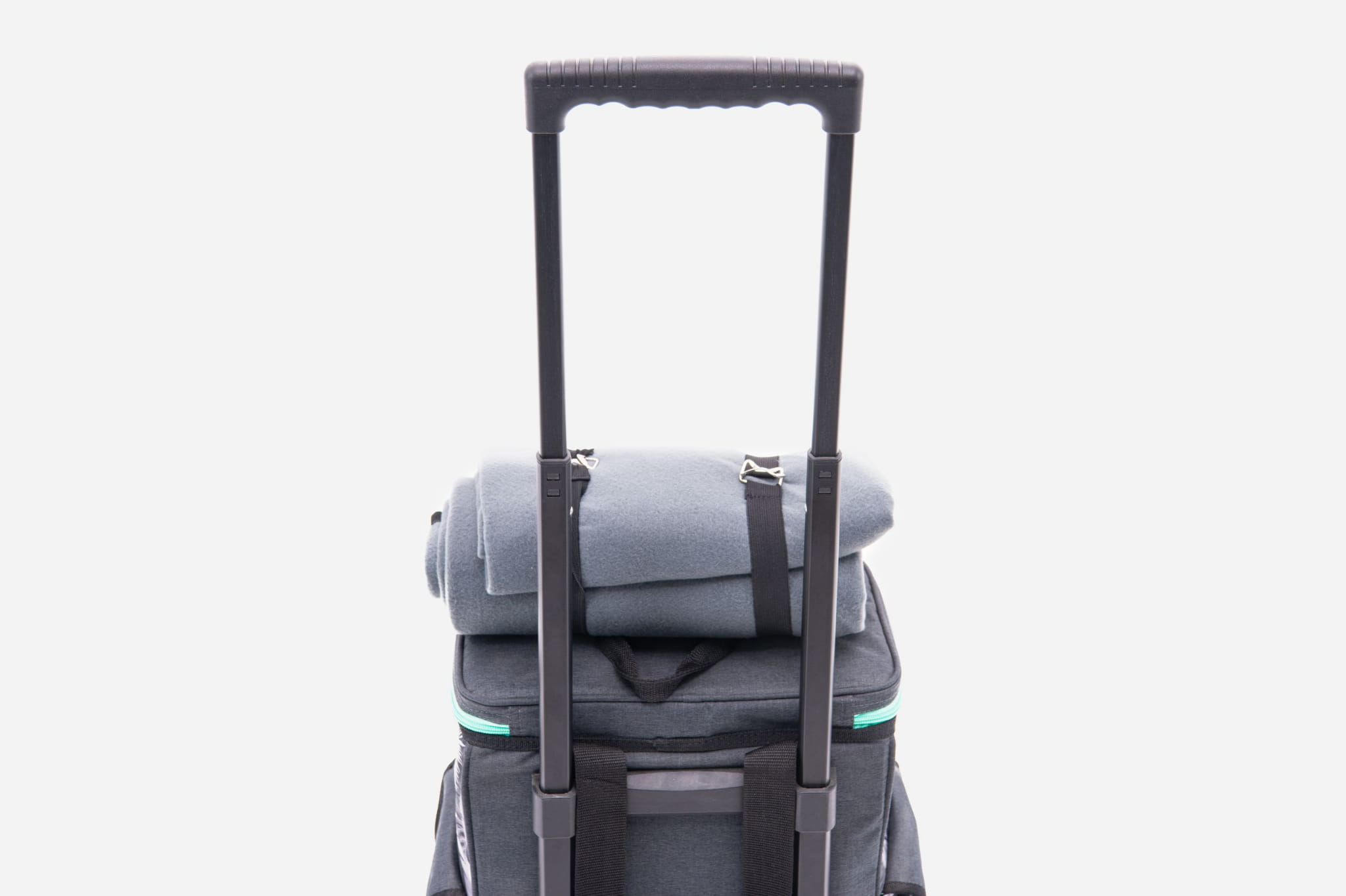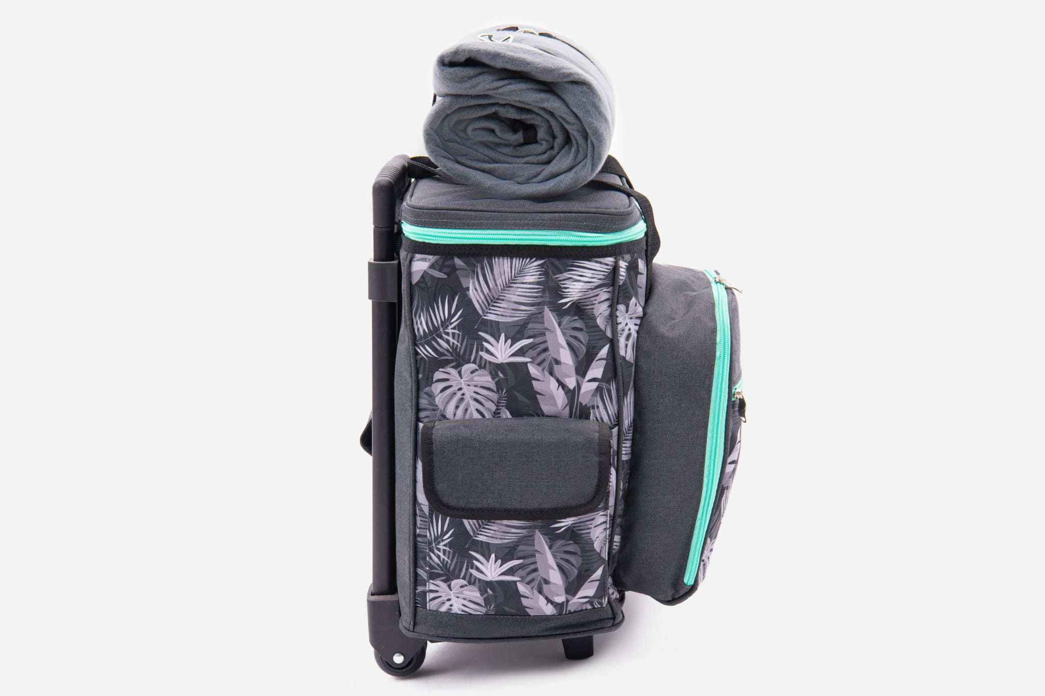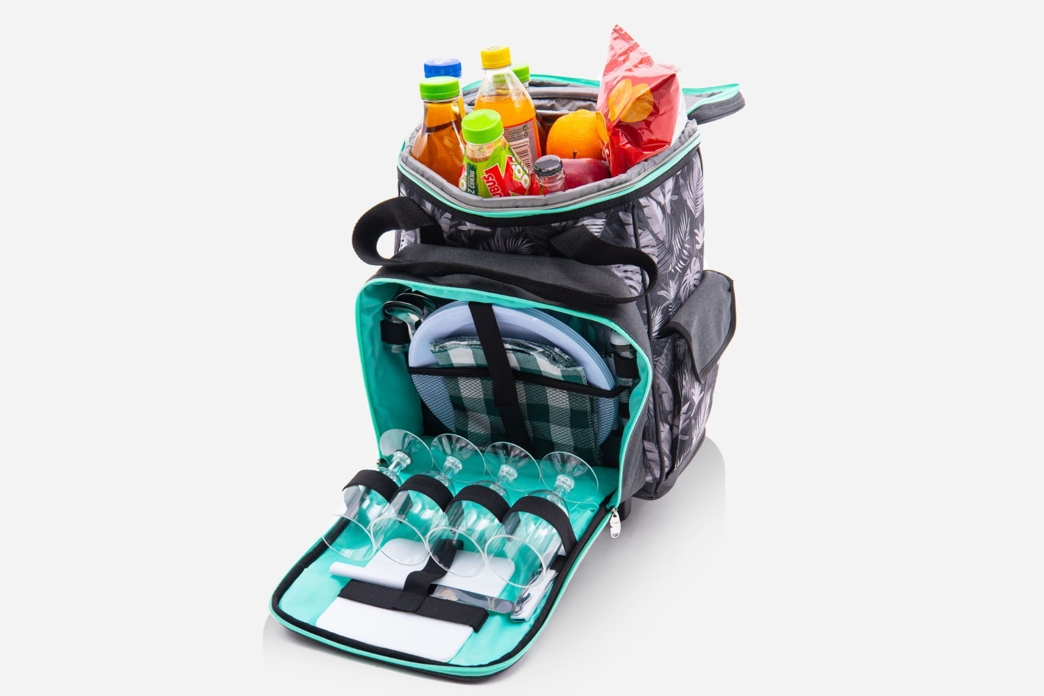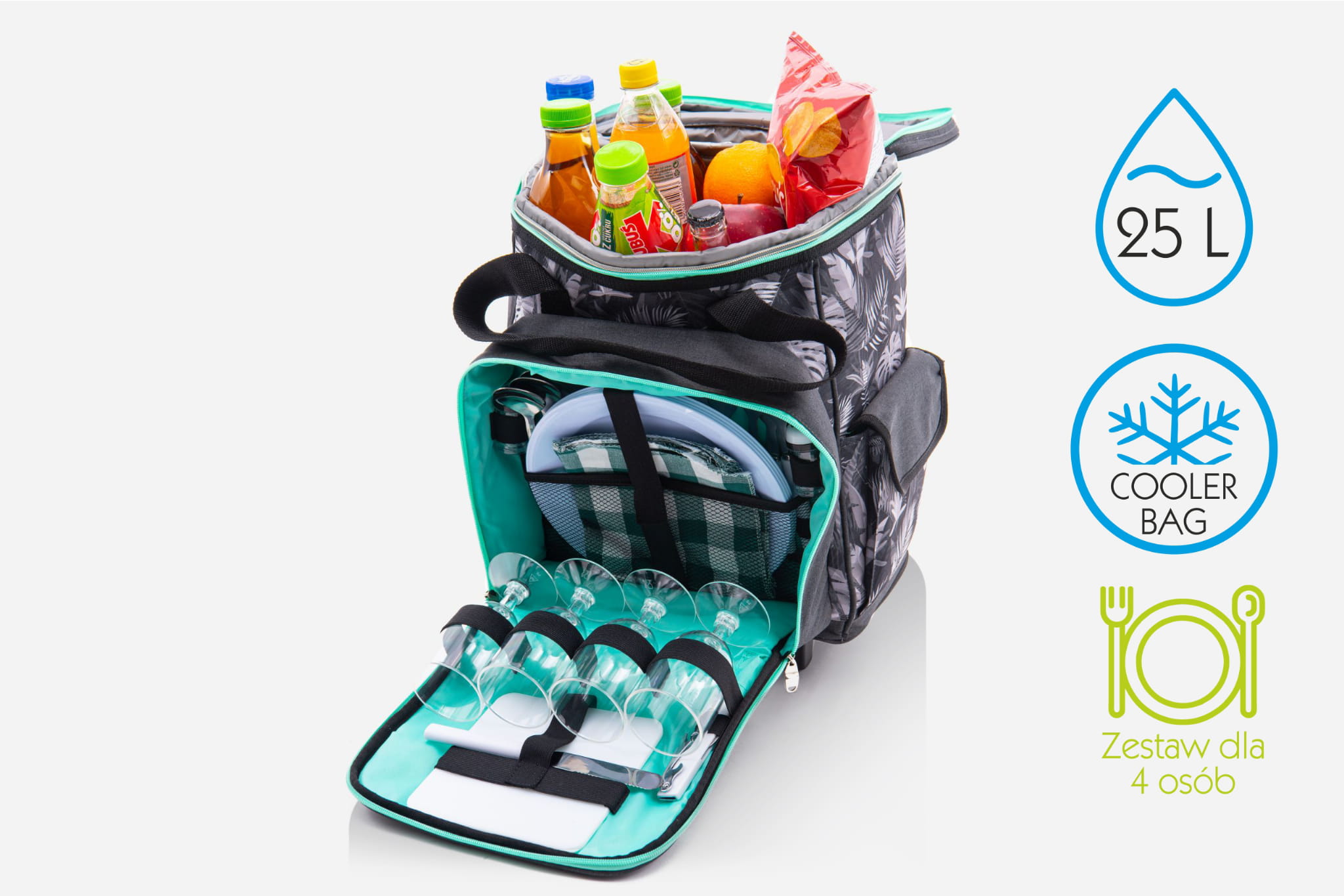 Turystyczna, izolowana walizka chłodząca na kółkach z rączką, CoolerBag, o pojemności 25 litrów z wyposażeniem dla czterech osób.