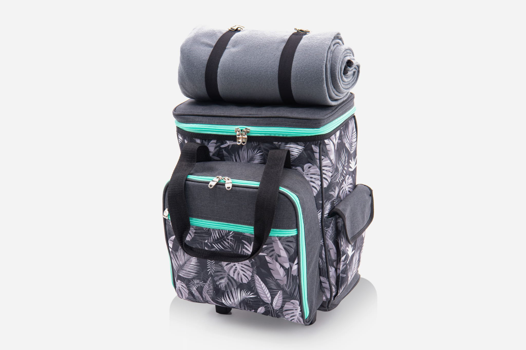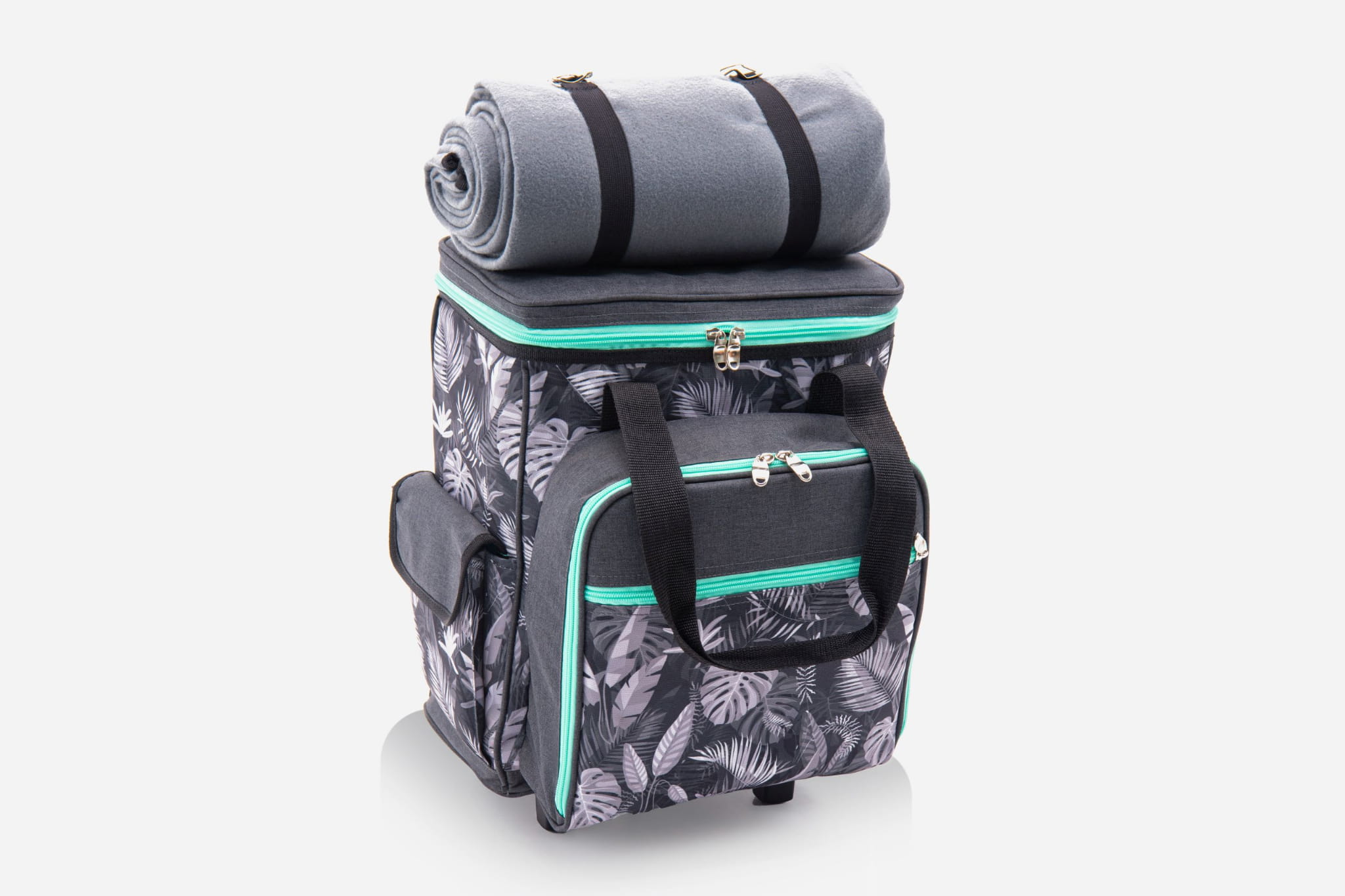 Turystyczna walizka chłodząca to idealny wybór na piknik, wakacje, wyjście do parku, czy na grill. Walizka charakteryzuje się bardzo dobrą izolacją cieplną. Wysokiej jakości materiał PEVA zapewnia doskonałą odporność na ciepło, dzięki czemu żywność i napoje pozostaną świeże, chłodne lub ciepłe przez kilka godzin. Wyposażona w koła oraz wygodny uchwyt do trzymania sprawia, że jest łatwa w transporcie. Walizka zawiera dwie komory zasuwane na zamek błyskawiczny. Jedna komora wyposażona została w zestaw naczyń i sztućców dla czterech osób, które są przymocowane gumowymi taśmami dla zabezpieczenia przed potłuczeniem. Druga komora jest to miejsce do przechowywania żywności oraz napojów. Mała kieszonka, która znajduje się na przodzie torby idealnie sprawdzi się do przechowywania np. dokumentów, kluczy czy telefonu. Dodatkowo torba posiada boczne kieszenie na drobiazgi. W zestawie znajdziemy koc piknikowy z izolacją, który można przypiąć na górze walizki. Jest to idealny zestaw na piknik czy kemping.