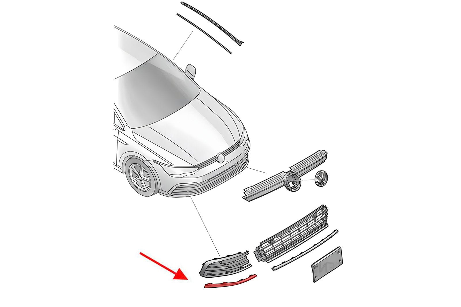 Chromowana listwa przedniego zderzaka prawa, dla VW GOLF 8 VIII (5H) 2020-2024 (wersja przed faceliftingiem).